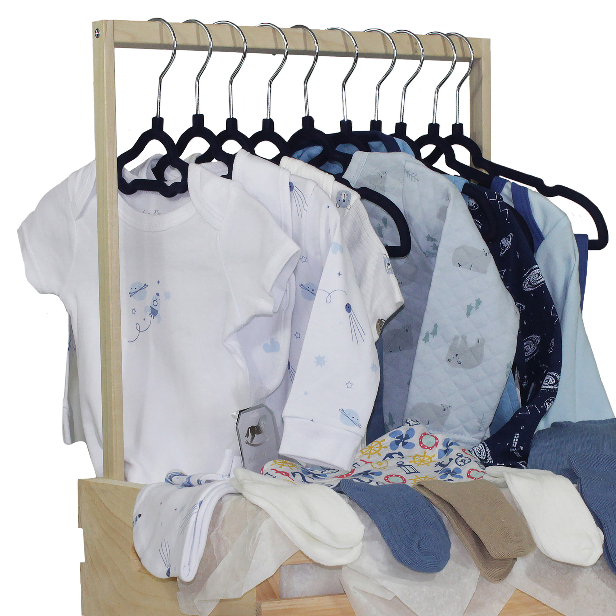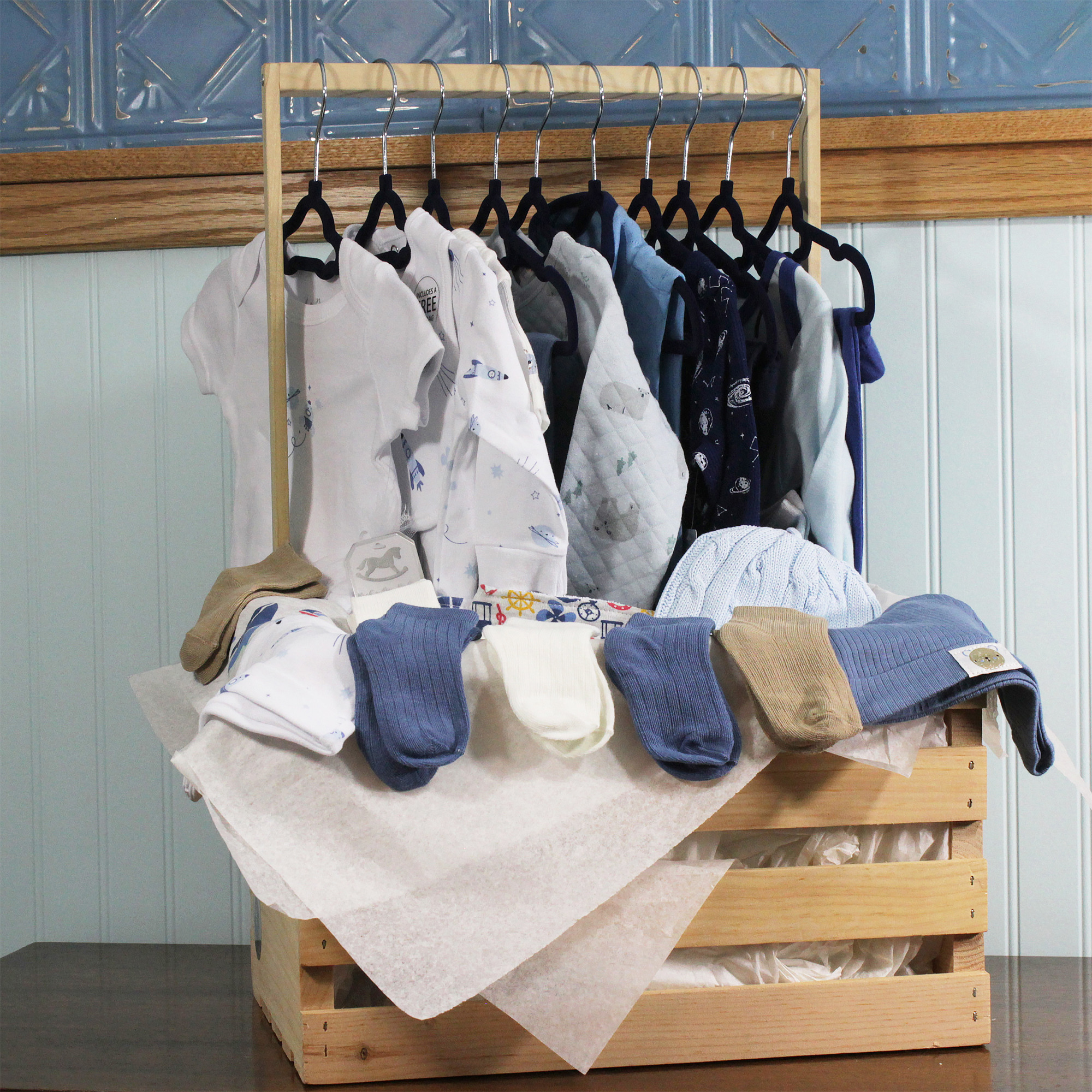 Celebrate his arrival with a gift as adorable and complete as his first year will be. This dreamy 38-piece baby shower wardrobe crate is overflowing with love, style, and all the clothing essentials a growing baby boy needs - thoughtfully designed to dress him from newborn snuggles to toddler tumbles. Each soft, sweet outfit is carefully chosen to mark every tender milestone, wrapped in themes of rockets, bears, galaxies, boats, and a touch of a future career in medicine. With clothing to fit every stage from birth to 24 months, it’s not just a gift - it’s a journey through his first precious years. Here is what is included by size: 0–3 months (Rockets theme) – His first outfit of love: a five-piece set including a cozy sleeper, bodysuit, beanie, bib, and anti-scratch mittens. 3–6 months (Bears theme) – Deep blues and playful details in a 10-piece set with bodysuit, pants, cap, bib, and six pairs of crew socks. 6–9 months (Bears theme) – This adorable quilted overall is as warm as it is charming with little bears and pine tree motif. 12 months (Galaxy theme) – Out of this world warmth with a long-sleeved waffle weave bodysuit, quilted vest, and matching pants. 24 months (Doctor theme) – A cozy, novelty set for chilly days: bodysuit, pull-on pants, and matching socks. Also included are extras fit for a prince – three novelty bandana bibs that feature boats, and a darling cable-knit beanie to keep him warm. All of this arrives in a beautifully crafted wooden wardrobe crate, ready to delight. With car-shaped flocked hangers and a removable hanging rod, it transforms into a keepsake nursery organizer - perfect for holding books, toys, or tiny treasures. Crate measures 15.8125 inches by 11.5 inches x 9.5 inches. Clothes hanging rod extension measures an additional 14 inches above the top edge of the crate. Crate is fully assembled, and clothes hanging rod requires minor assembly with 6 included wood screws.