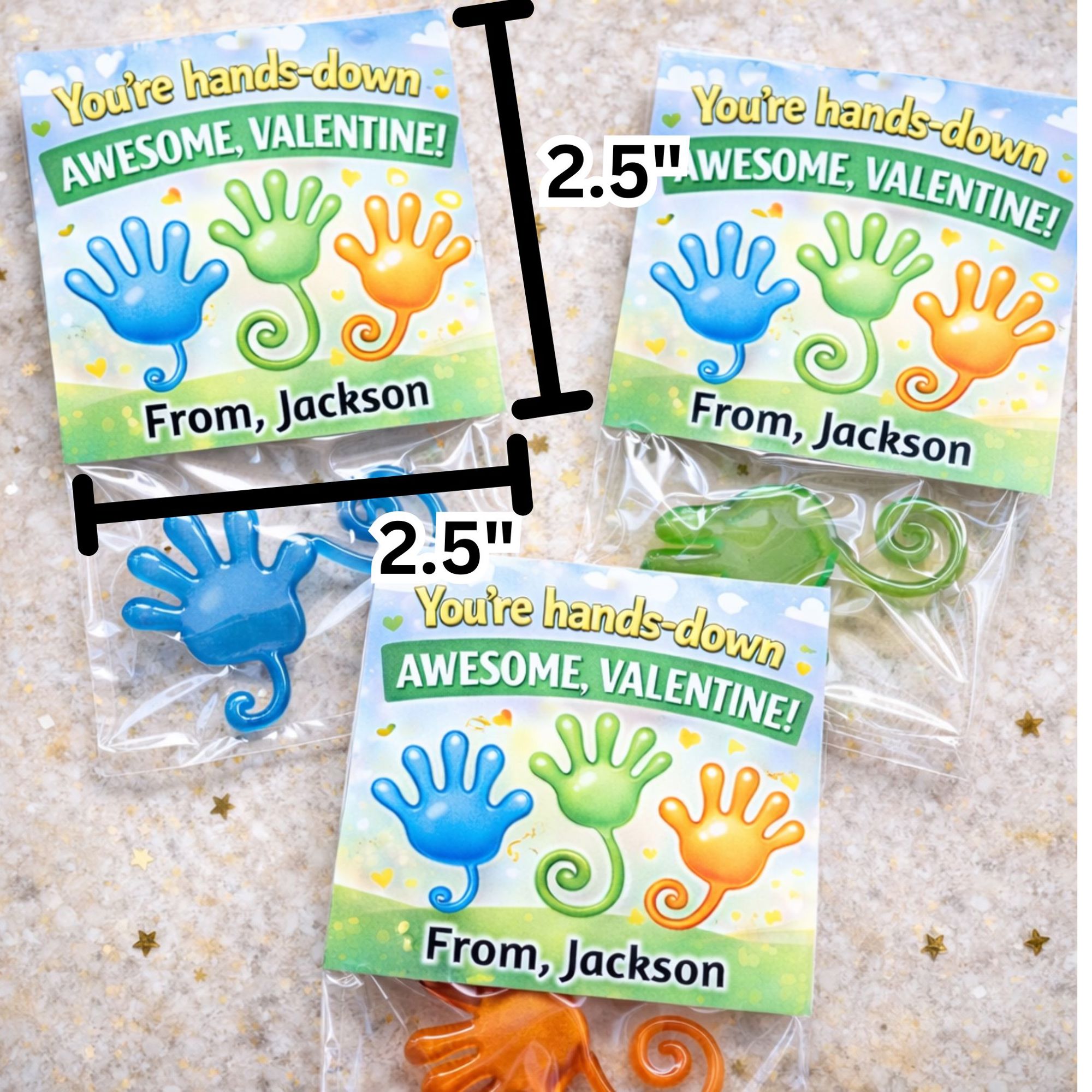 Get 12 Large Valentine Stickers customized with your child's name and make Valentine's Day for classmates a breeze! Choose from 10 unique designs, made for specific valentine favor ideas that makes Valentine's Day easy - simply peel and stick on a yummy snack or sweet gift that kids will love!
