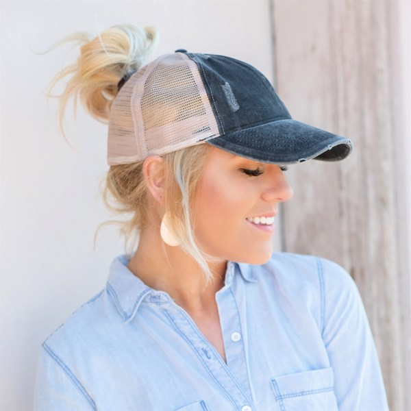Cute hat! Fits well, adjustable Velcro and option for ponytail higher or lower.