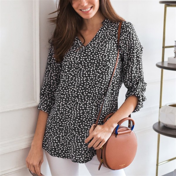 Shirt is pretty but material is waxy and the top is very long. Sleeves are really long and difficult to roll as well. I havent decided if I'm going to keep it yet. I love the style and print I just wish it wasn't so long and sleeves were easier to work with.