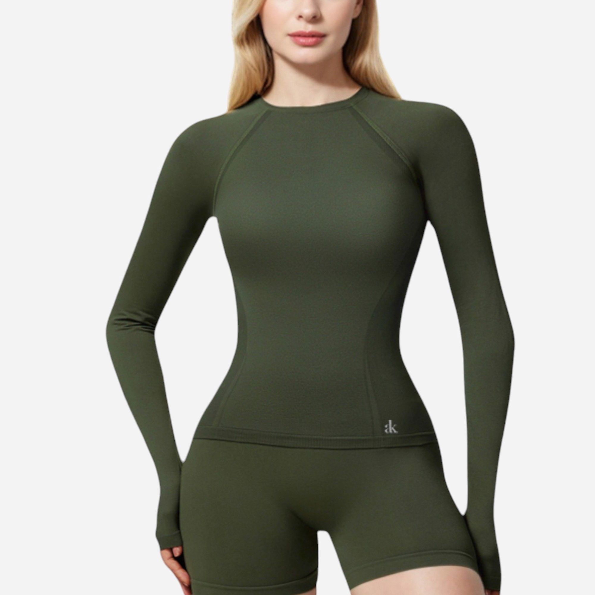 Women's Long Sleeve Fitted Crew Neck Top with Thumbhole Cuffs and Seam Detailing