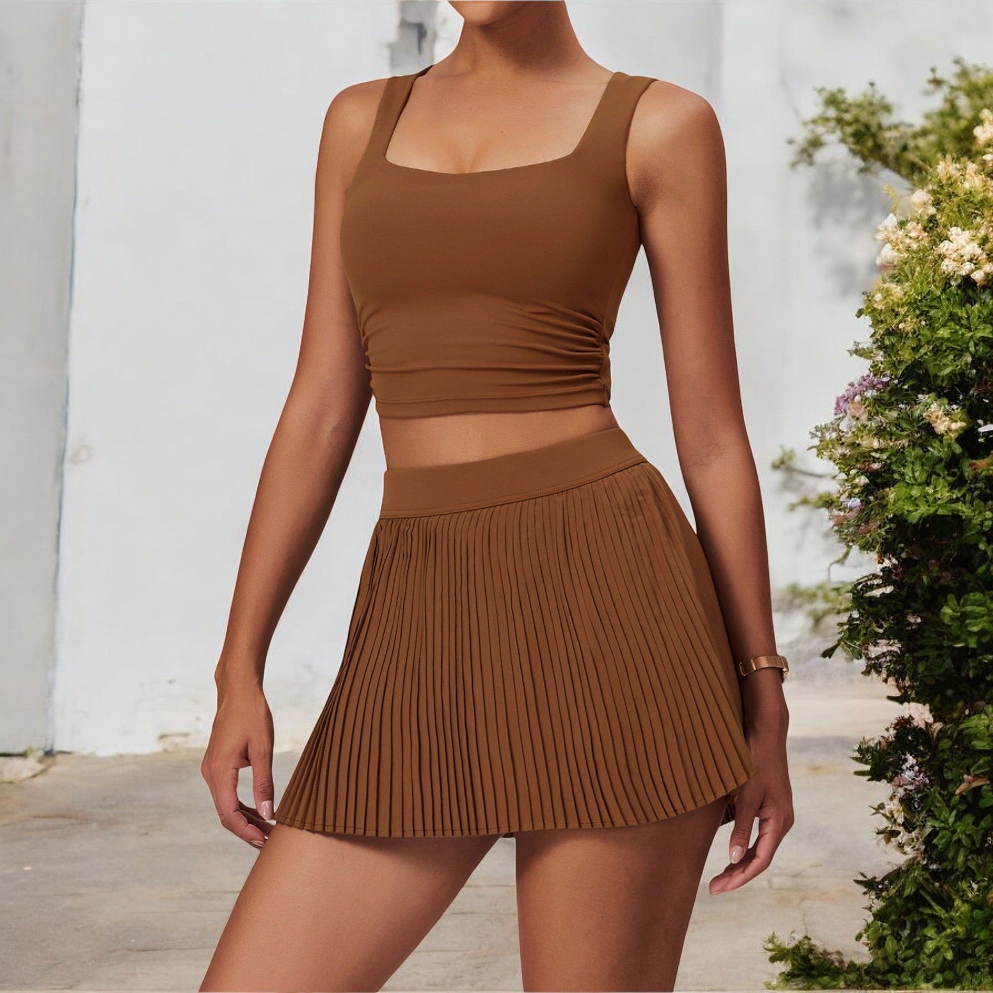 Women's Pleated Detail Square Neck Sports Bra with Wide Straps and Fitted Design