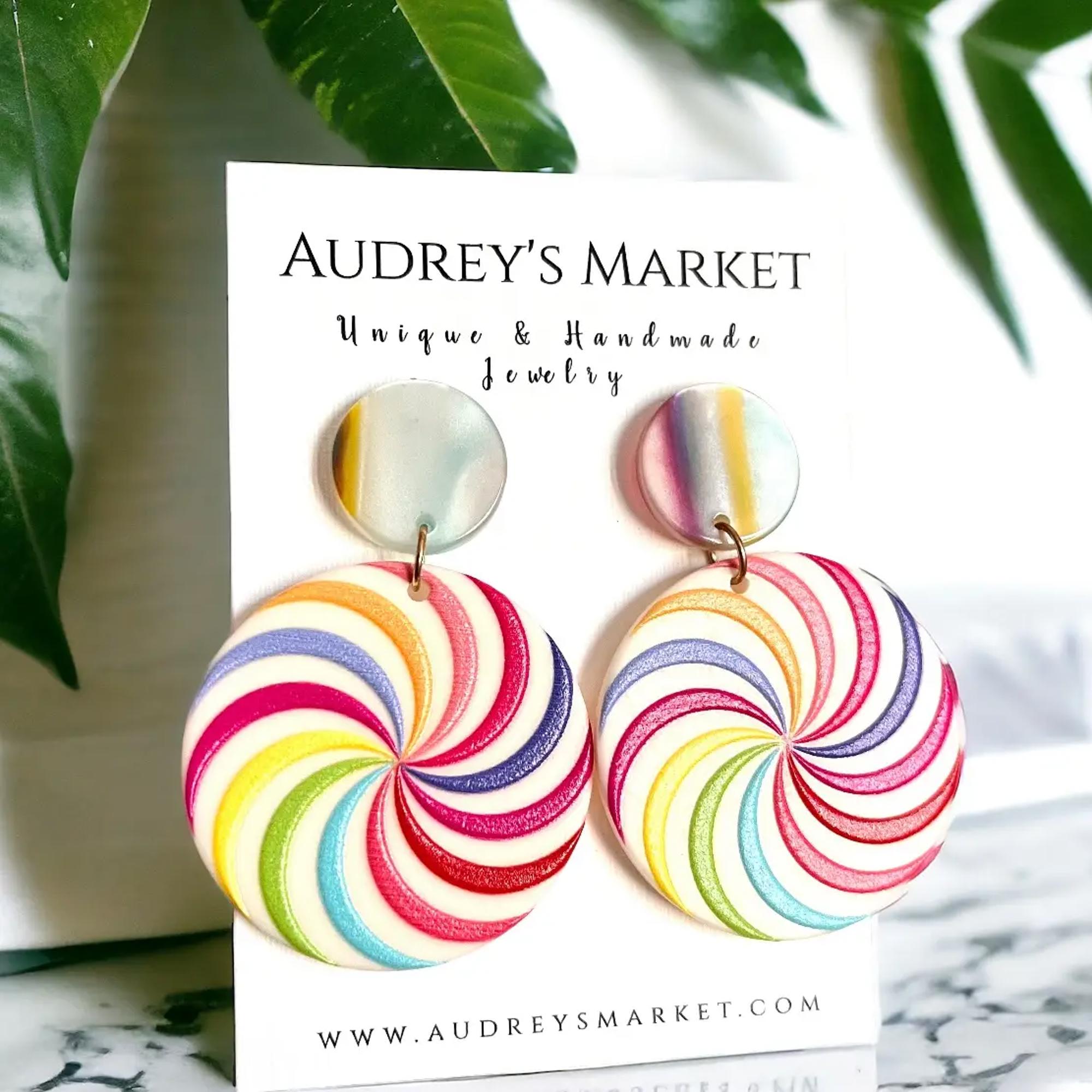 Light up your style with these lightweight, multicolored disc earrings! An ideal addition to any ensemble, these eye-catching earrings will undoubtedly add a pop of joy into your day. Measures about 2 1/4" high by 1.5 wide.