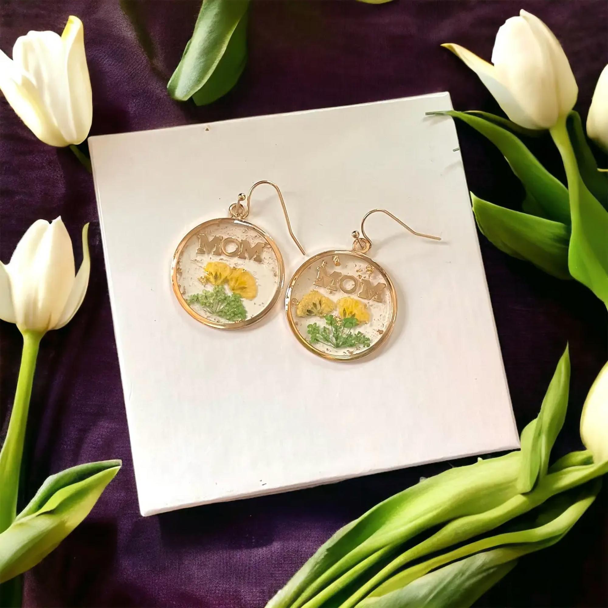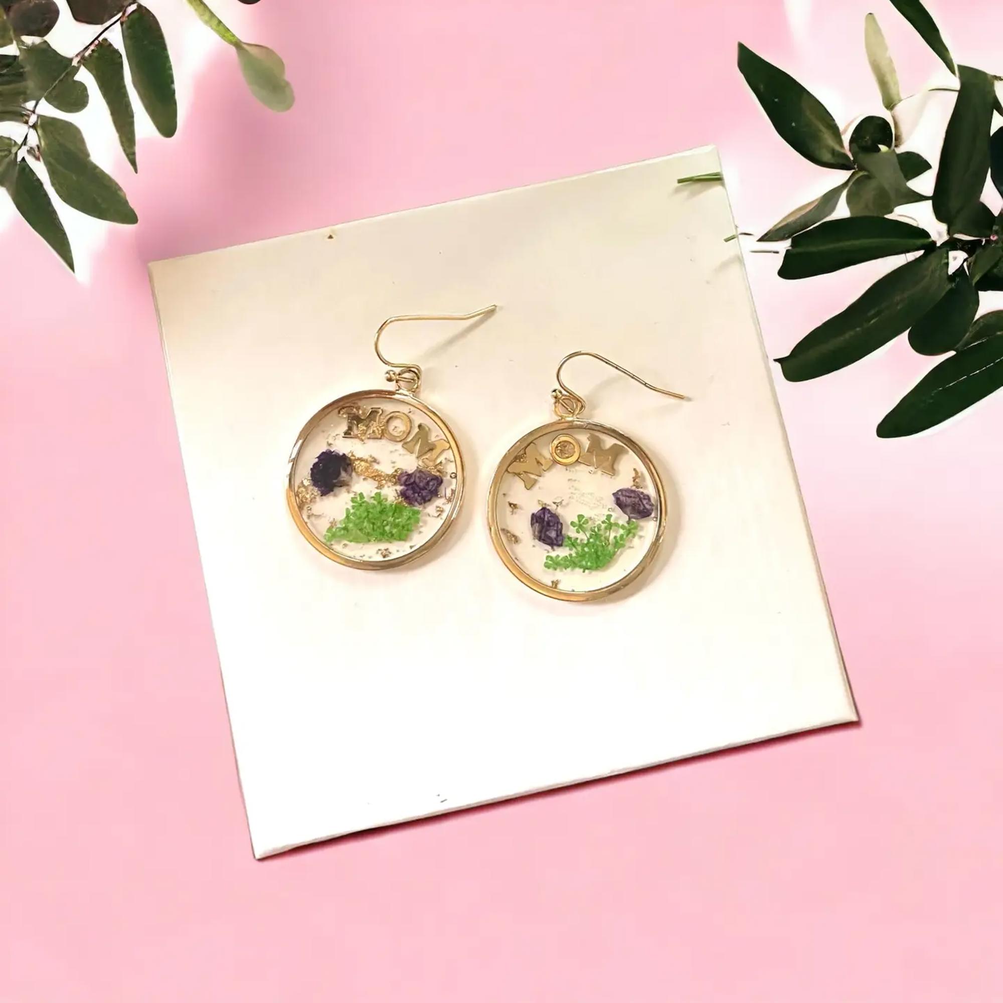 Pressed Flower Resin MOM Gold Earrings - Christmas Gift For Mother