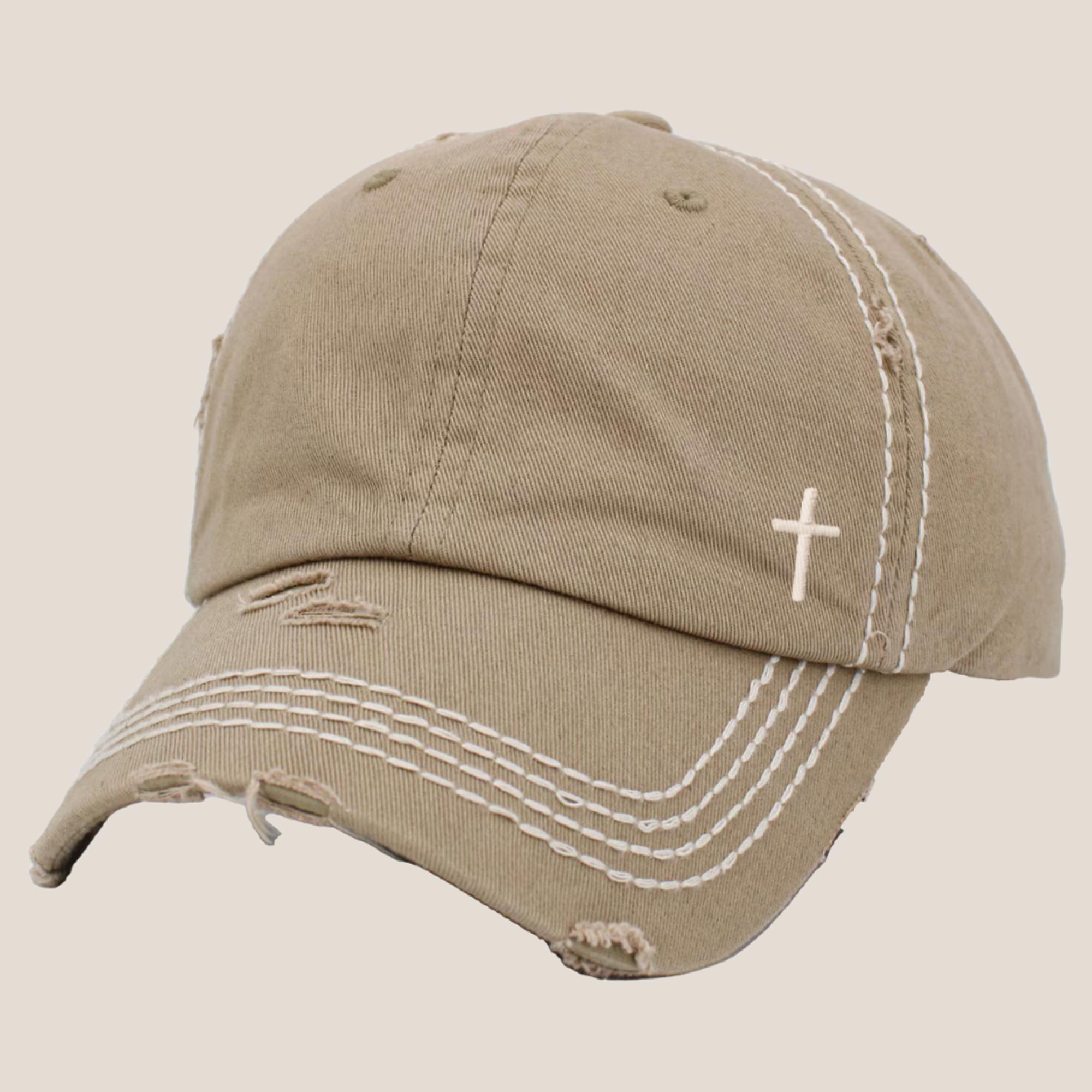 Mini Embroidered Cross Distressed Cap, Choose Hat Color