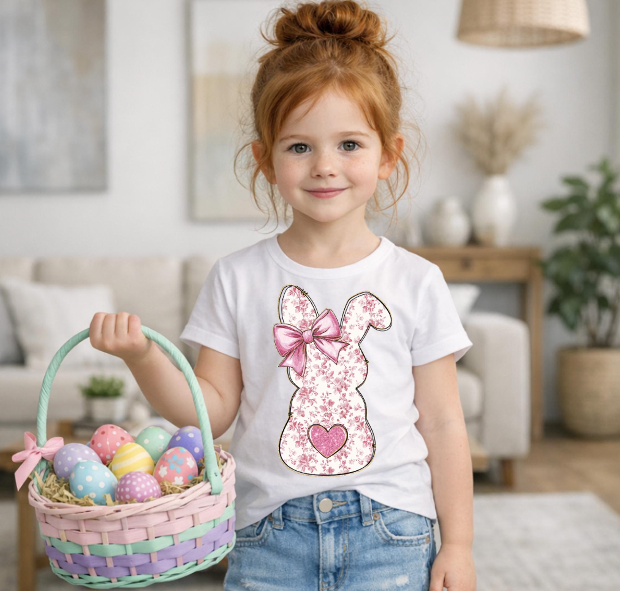 Pink Toile Bunny with Bow Girls Easter Bunny Tee Shirt