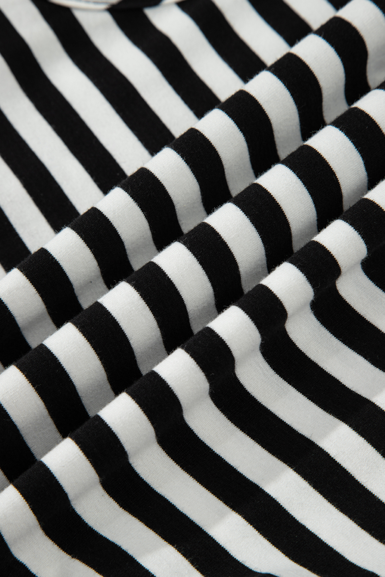 This striped dress features chic U-necklines and sleeveless designs for a modern look.