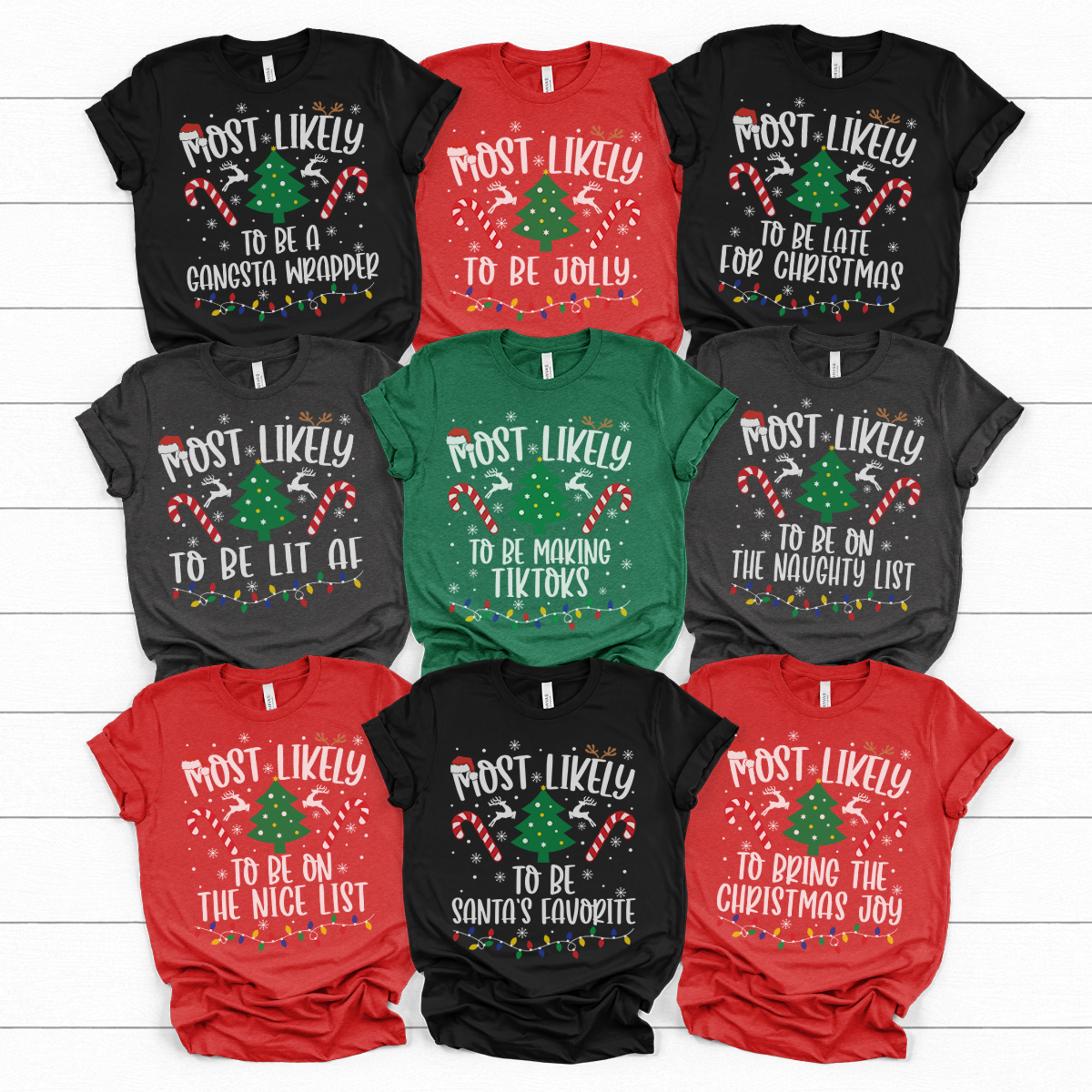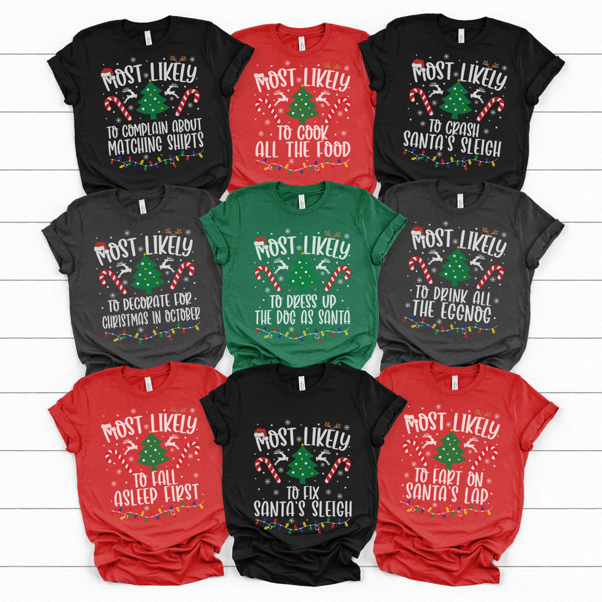 Christmas Most Likely Graphic Tee, 25+ Sayings, Funny Christmas Shirts, Matching Christmas Tees, Adult Christmas Tee
