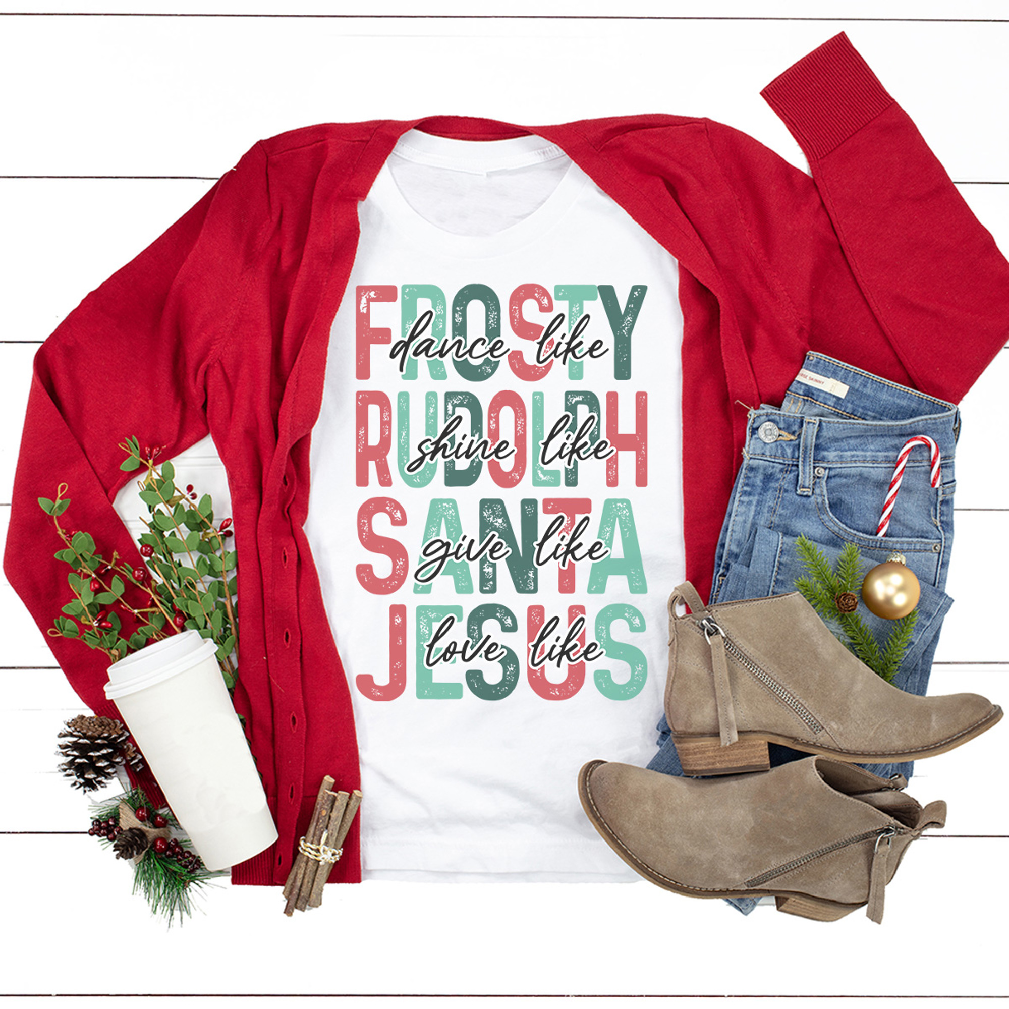 Dance like Frosty, Shine like Rudolph, Give like Santa, Love like Jesus, this Christmas season in this trending new graphic tee! Spread some holiday cheer in this feel good holiday tee that is the perfect reminder of what the season’s all about! Made on soft, high-quality Comfort Colors tees, it’s perfect for pairing with jeans, leggings, or your favorite flannel for a relaxed holiday look. Great for parties, gift giving, or just soaking up the Christmas spirit all season long.