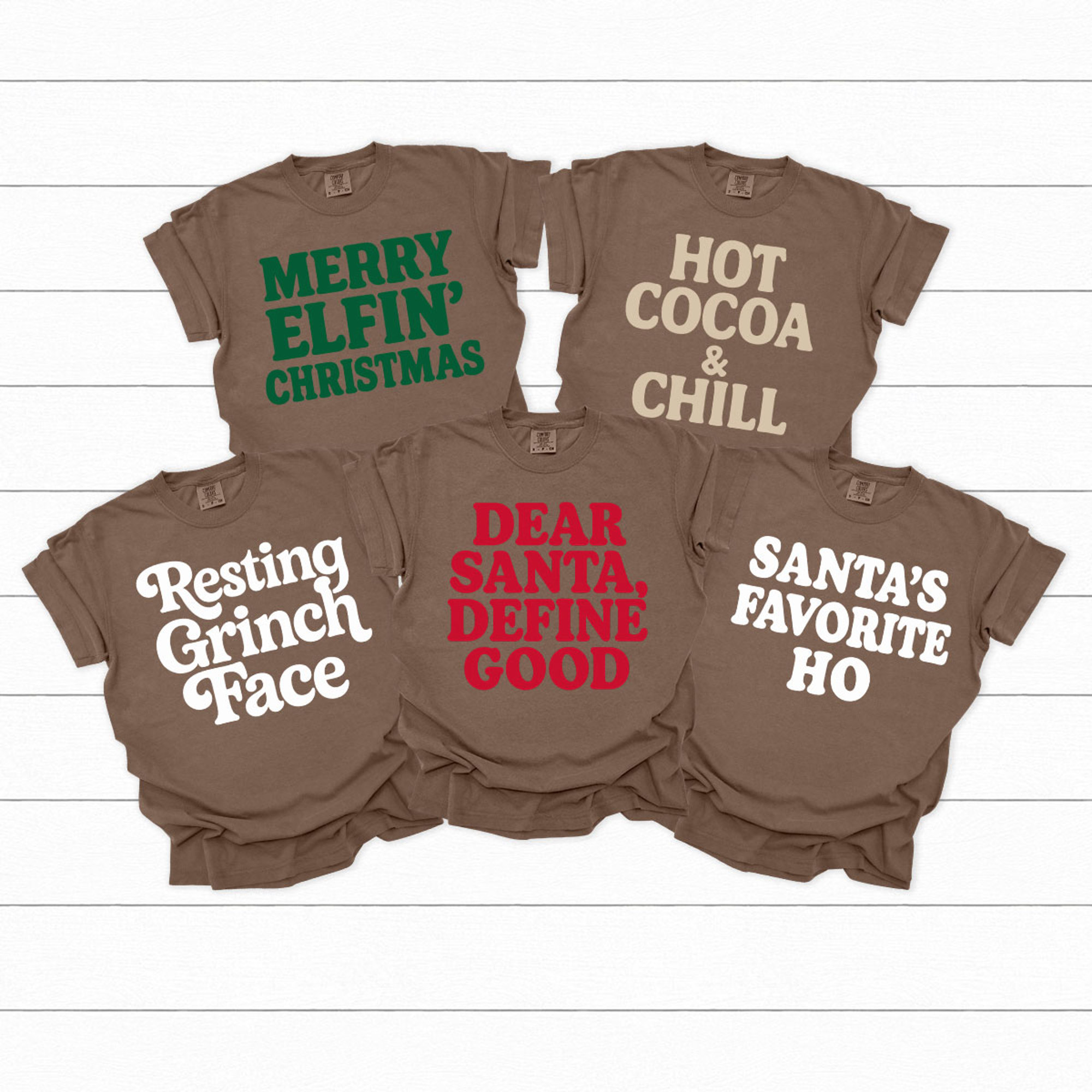 Get into the holiday spirit with the Funny Christmas Holiday Comfort Colors Tee! Perfect for family gatherings, this festive tee comes in 5 hilarious designs to choose from: Merry Elfin' Christmas, Hot Cocoa & Chill, Resting Grinch Face, Dear Santa Define Good, and Santa's Favorite Ho. Soft, comfy, and full of holiday cheer, it’s the ultimate way to celebrate Christmas with humor and style.