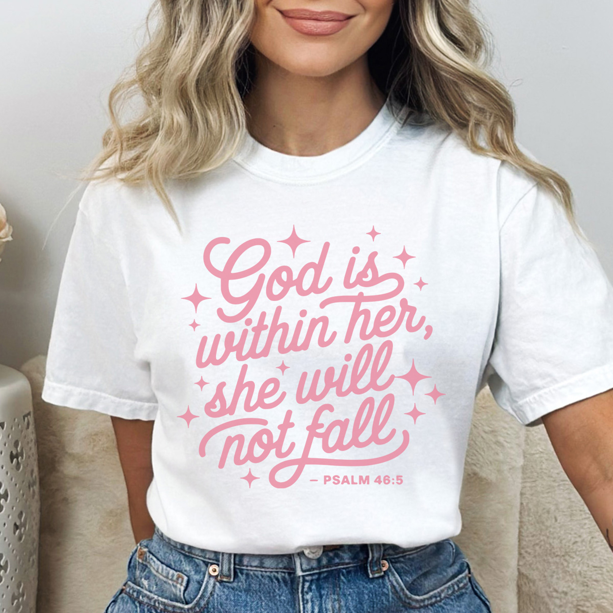 Our new bible verse inspired God Is Within Her She Will Not Fall graphic tee is a daily reminder of strength, grace, and belief. Designed for everyday wear on Comfort Color tees, it pairs effortlessly with jeans or layers for a cozy, casual look—perfect for church, errands, or sharing your faith wherever you go.