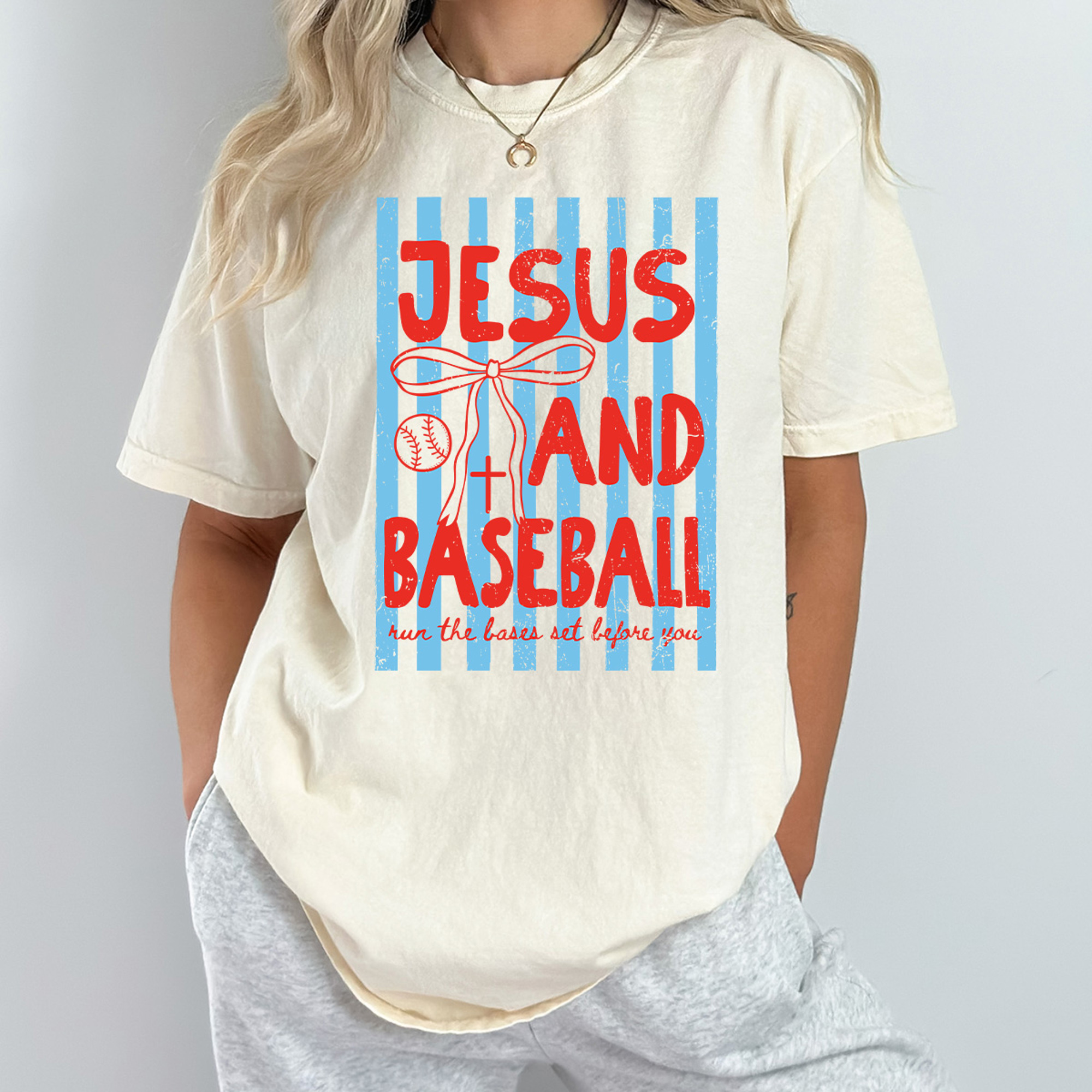 The Jesus And Baseball Graphic Tee combines faith and fun for fans of the game and the Gospel alike. Featuring a playful ball game-inspired design with a faith-filled message, this tee is printed on soft, garment-dyed Comfort Colors fabric for a relaxed, comfortable fit. Perfect for baseball games, casual outings, or sharing your love for Jesus in style, it’s a trendy and uplifting coquette tee for everyday wear.