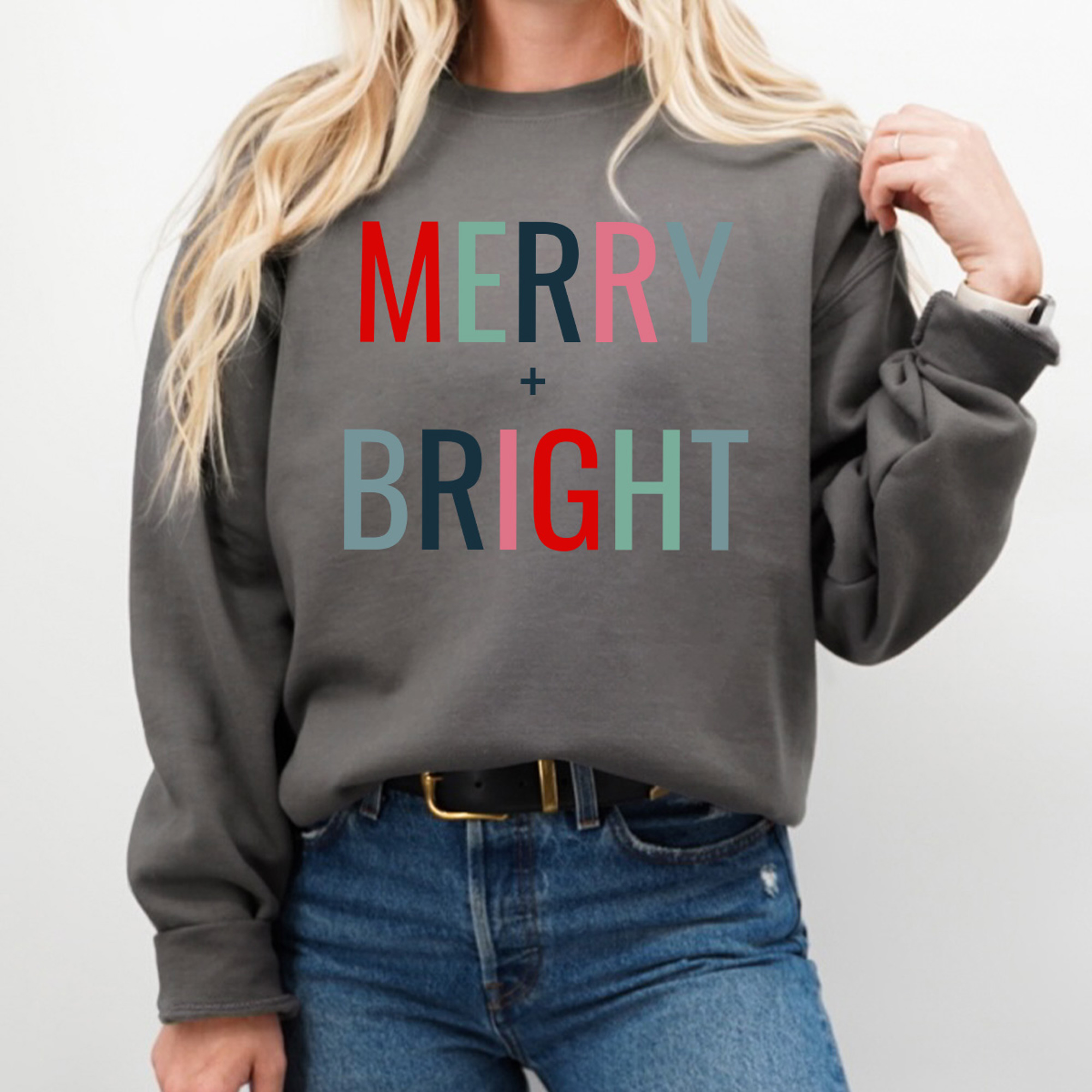 Merry + Bright Fleece Sweatshirt, Christmas Pullover, Holiday Graphic