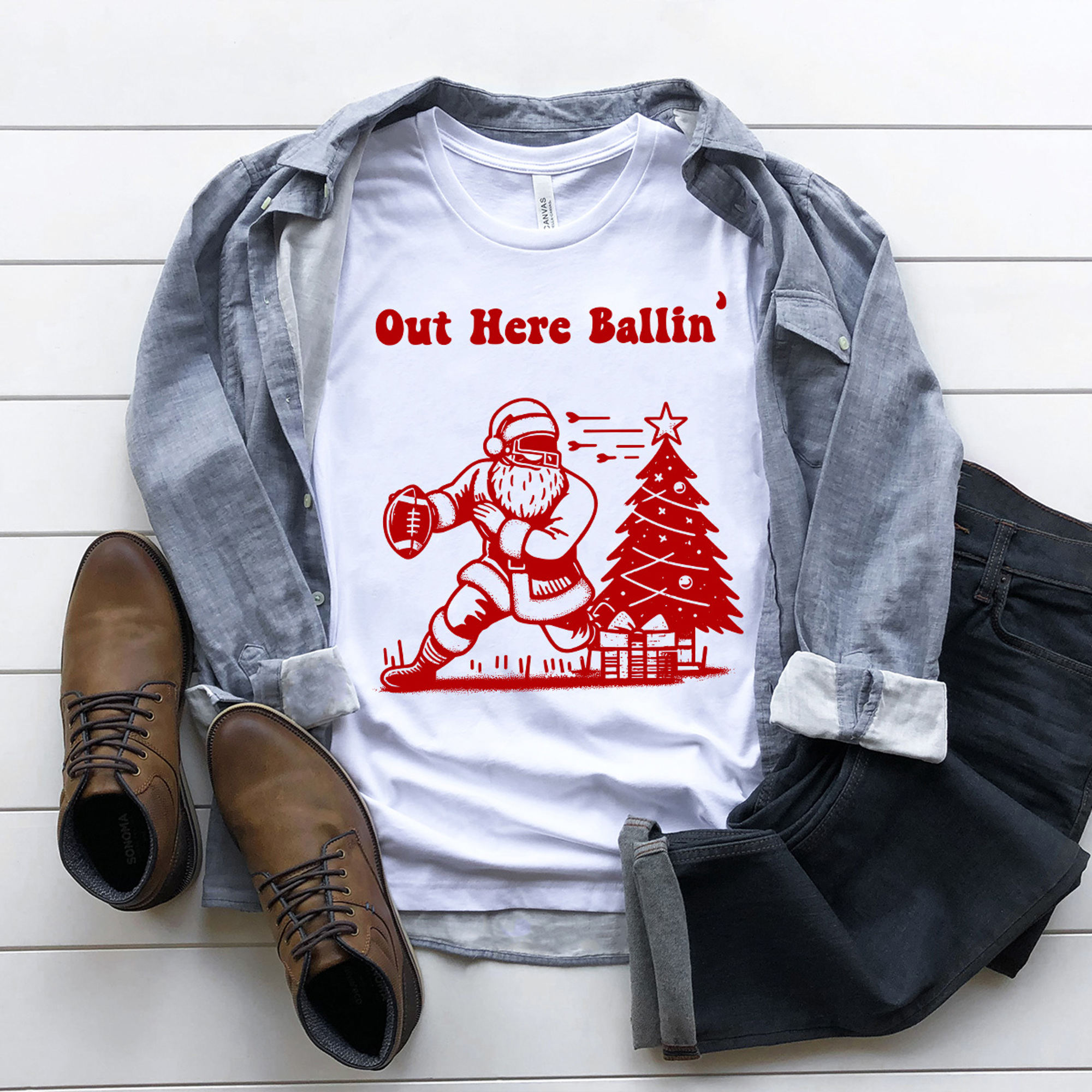 Out Here Ballin' Football Santa Men's Graphic Tee, Sports Christmas Shirt, Christmas Gift For Husband