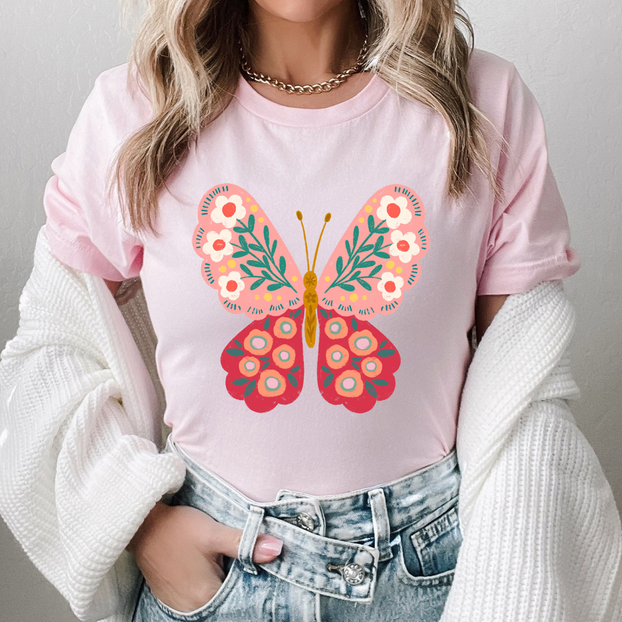 The Spring Pink Flower Butterfly Graphic Tee showcases delicate pink blooms with a graceful butterfly, perfectly capturing the beauty of spring. Made from soft, comfy fabric, this tee is ideal for everyday wear or layering for warmer days. With its charming floral and butterfly design, it’s a standout spring flowers shirt that brings a touch of whimsical elegance to any outfit.