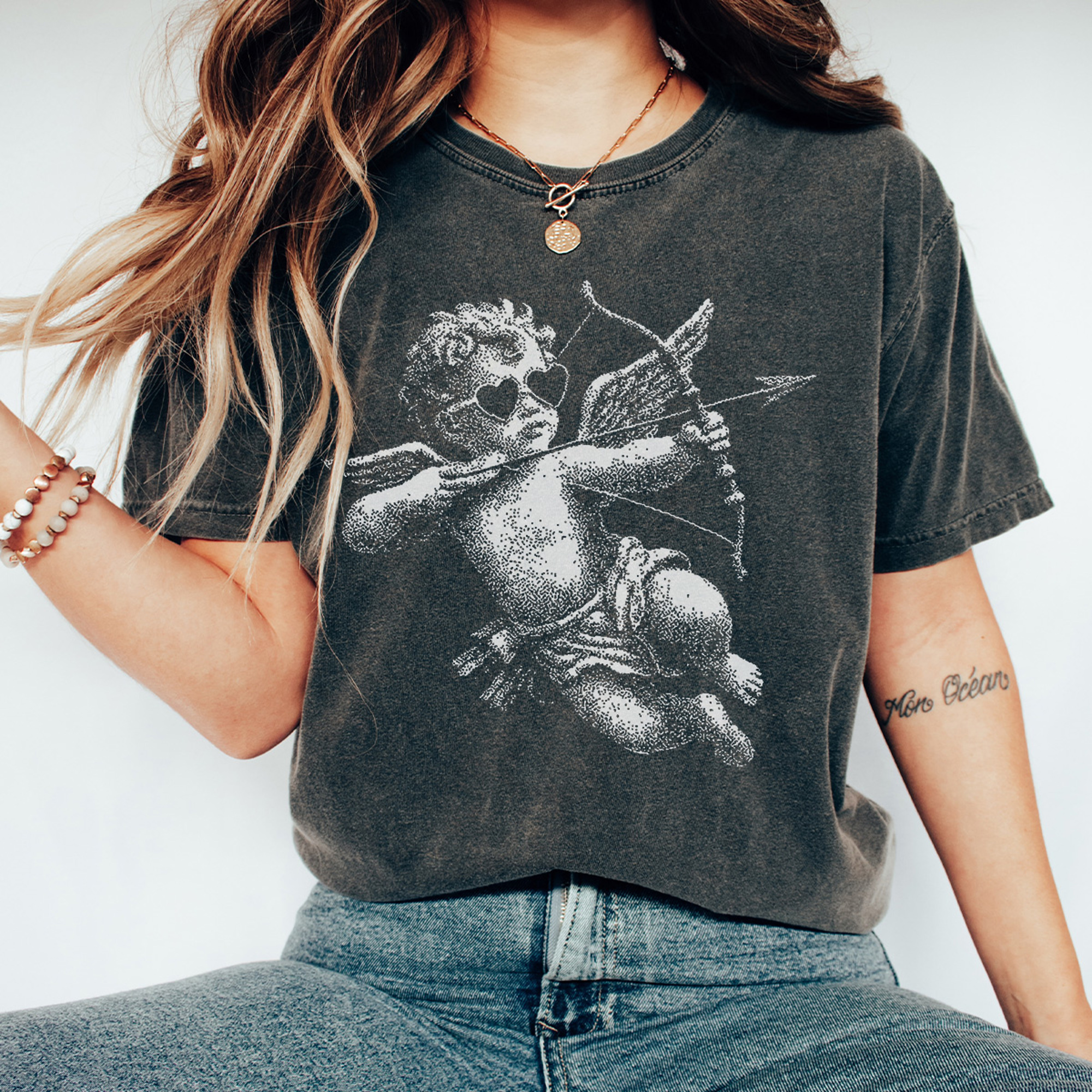 Celebrate Valentine's Day in style with our trendy new Cupid Graphic Tee! Right on style and looks so cute with your favorite cardigan and jeans for an effortless Valentine's Day outfit. Made from Comfort Color tees, the fit will leave you comfortable all day long!