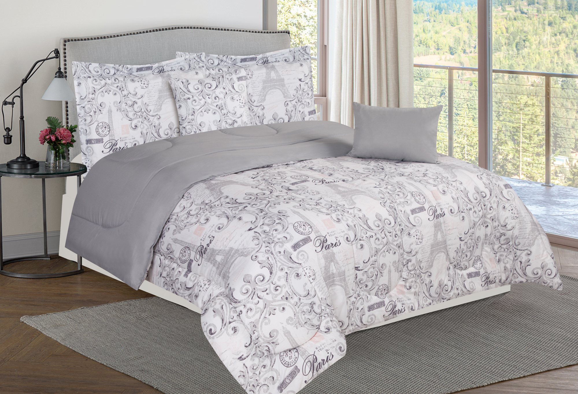 This elegant and chic comforter set will give your bedroom a fashionable makeover! The fresh color palette makes a bold statement. This bedding set is guaranteed to leave an unforgettable impression on all your guests and friends. The super soft microfiber comforter reverses to a coordinating geometric pattern. Available in Queen and King sizes, the set includes a comforter, two standard or King shams, and two complementary decorative pillows to complete the look.