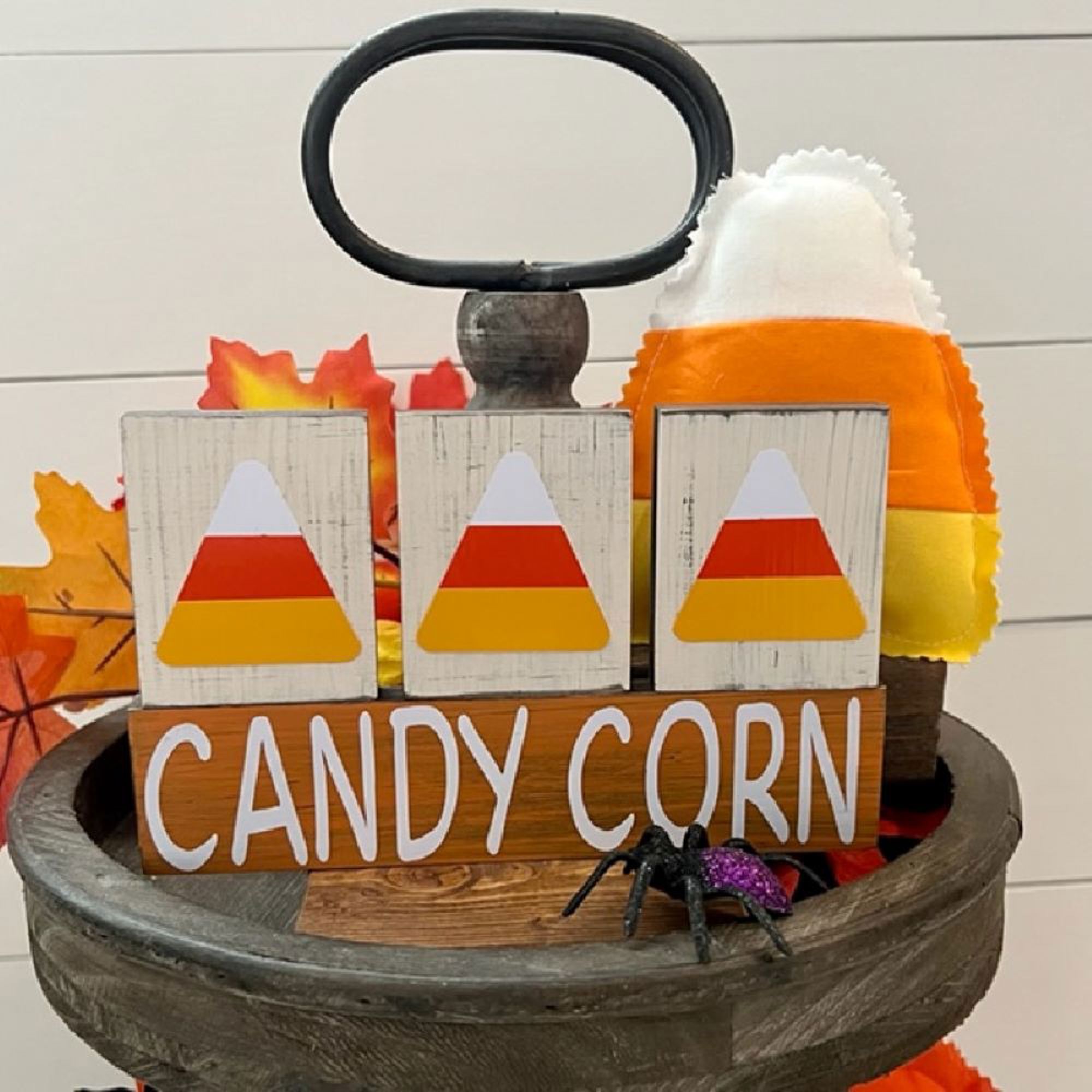 * Candy Corn blocks measure 7" long x 4" tall at the highest stacked blocks. 1/2" deep. Base block is painted orange with top 3 blocks painted cream.