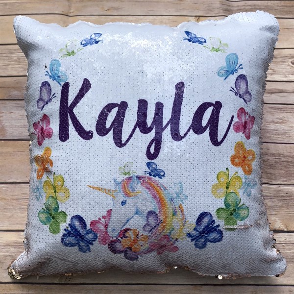 Love the design and strong color of the sequins. The only reason it’s 4 stars is that it’s a little smaller than your average pillow to insert into it, luckily I had a smaller one on hand. You can still see the name even when the sequins are flipped to the all one color side. That being said, my 5 hear old loved it for a birthday gift!