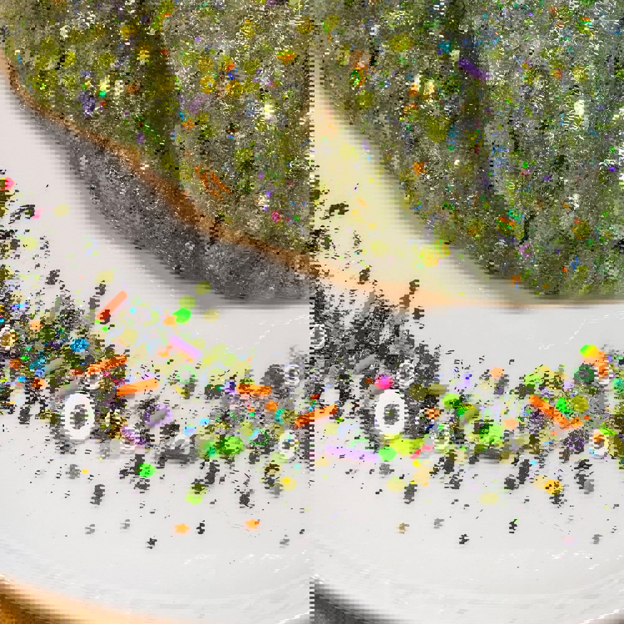 * ‘Creepy Crawly Creature Dust’ Slime Confetti Mix: Colorful confetti for extra fun that is glow-in-the-dark!