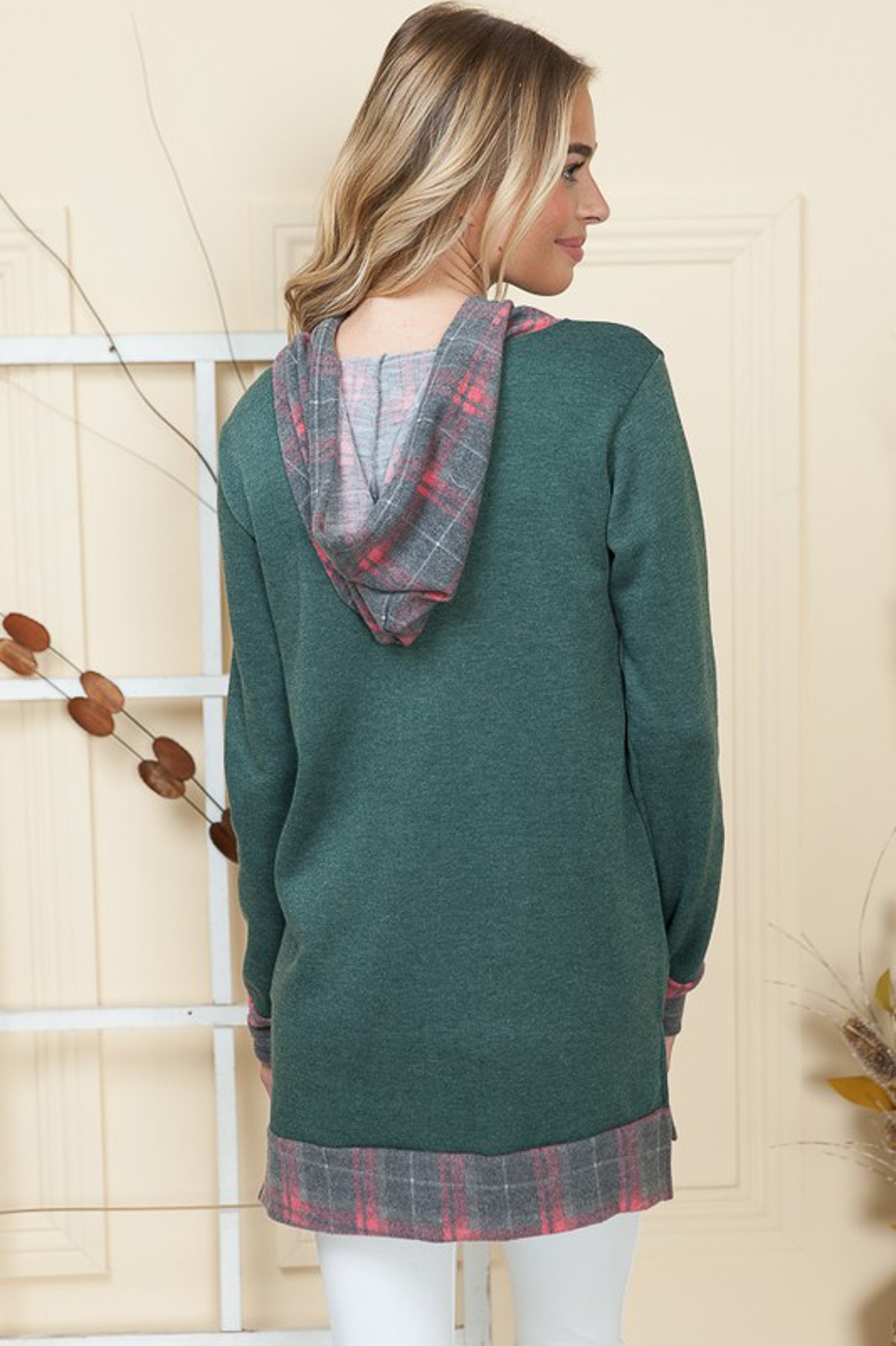 BRUSH HOODED SOLID TUNIC TOP WITH PLAID CONTRAST