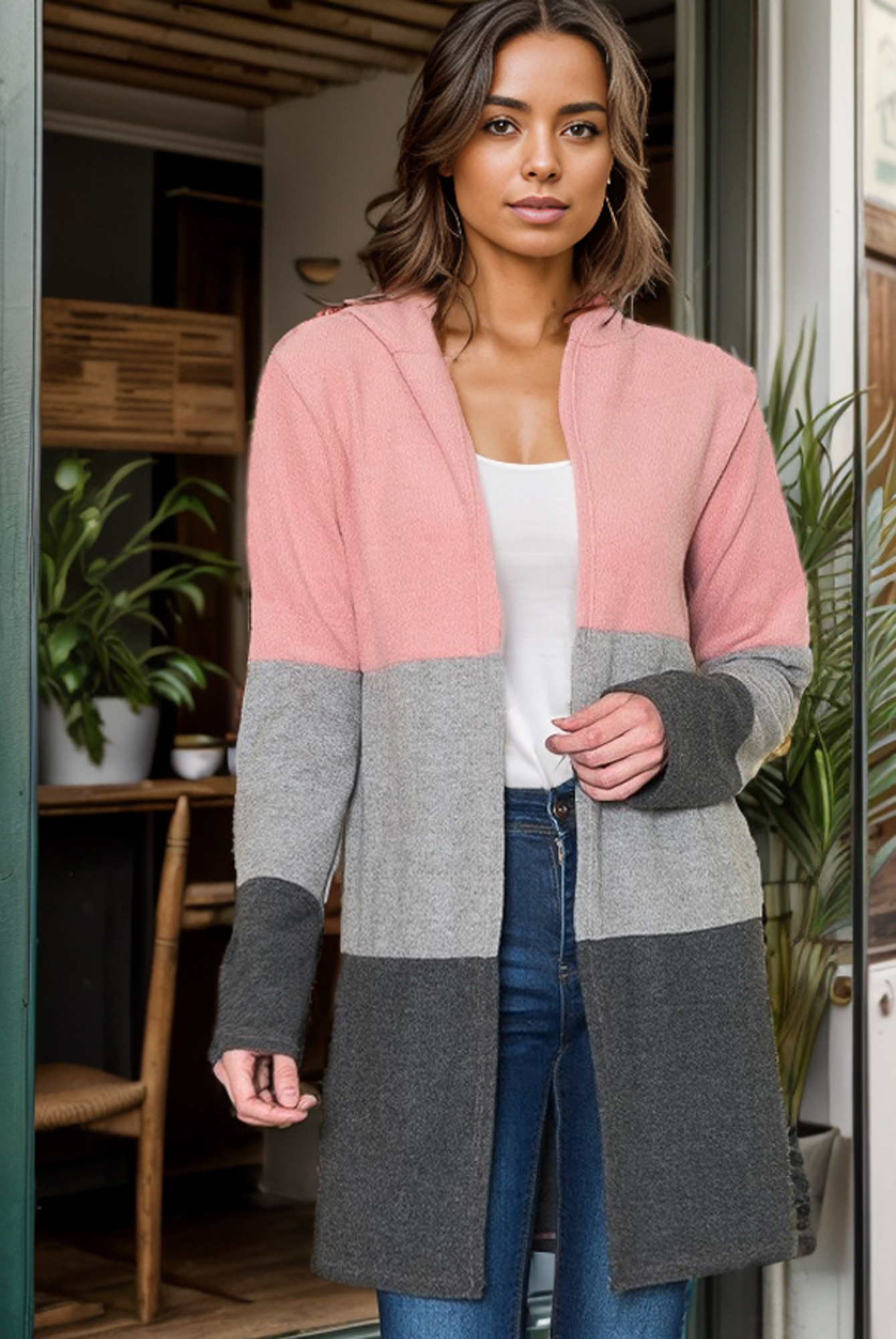 HOODIE COLOR BLOCK LONG CARDIGAN