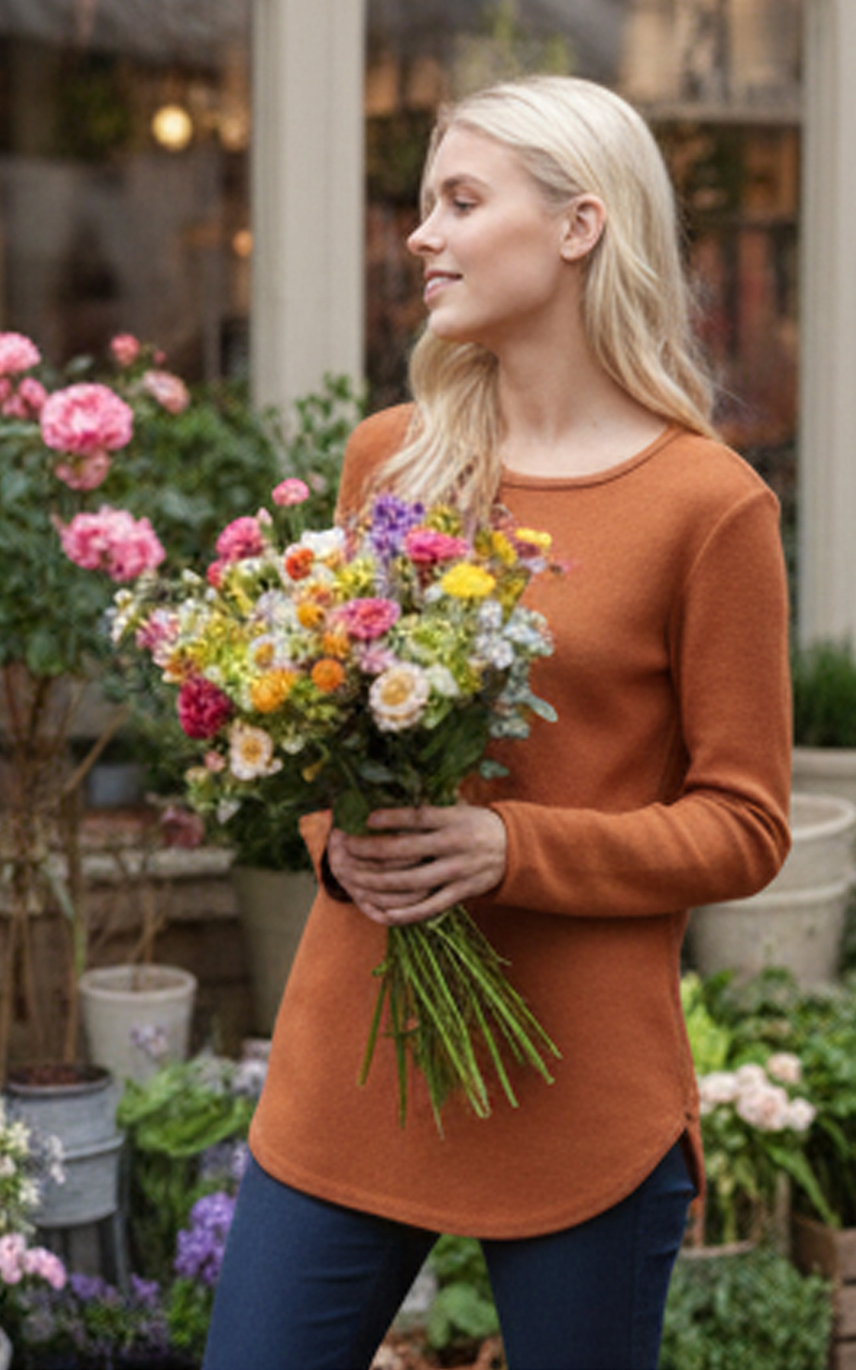 It has long sleeves, a hip-length hem, and small side slits at the hem for ease of movement and a flattering fit, giving it a cozy, seasonal feel that works well for fall or transitional weather.