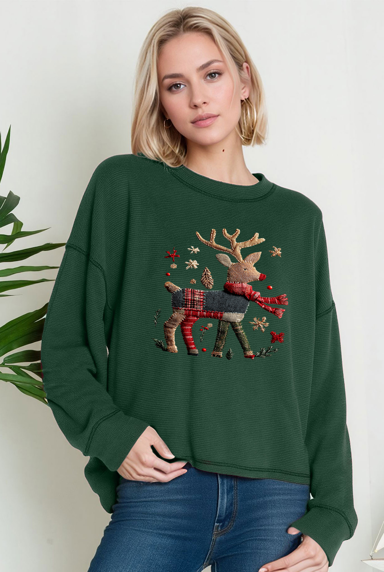 Christmas Theme Reindeer Embroidery look-like Print