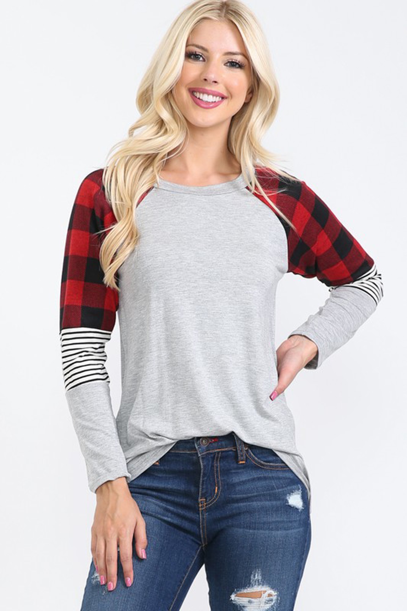 RAGLAN TUNIC WITH PLAID AND STRIPE CONTRAST SLEEVES