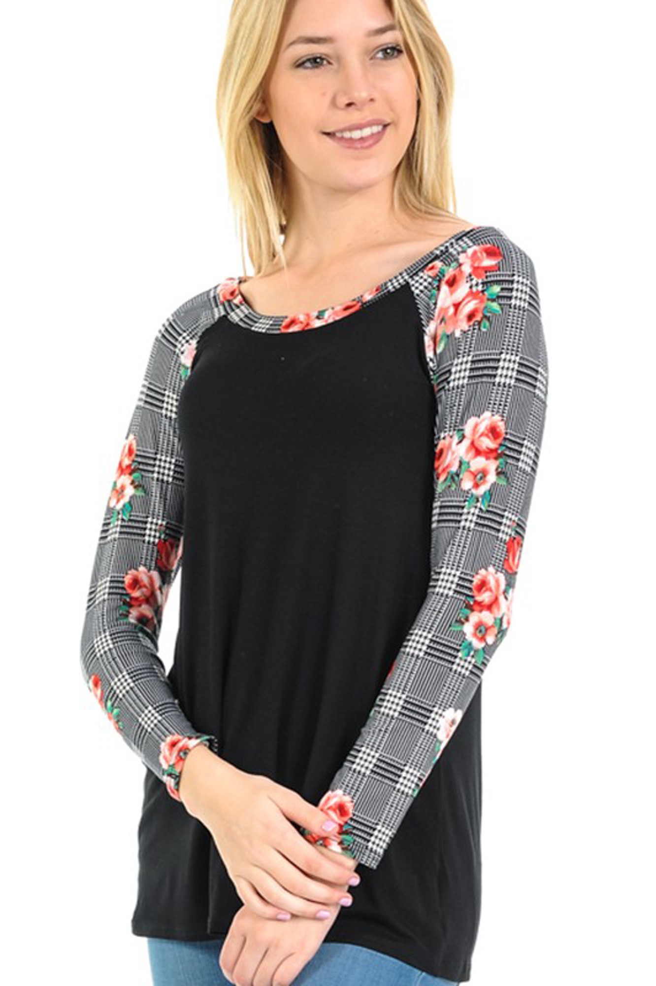 SOLID TOP WITH CHECK/FLORAL PRINT SLEEVES