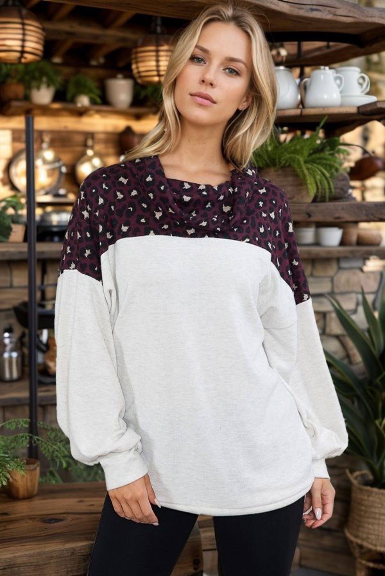 SOLID TUNIC TOP WITH ANIMAL CONTRAST AND PUFF SLEEVES