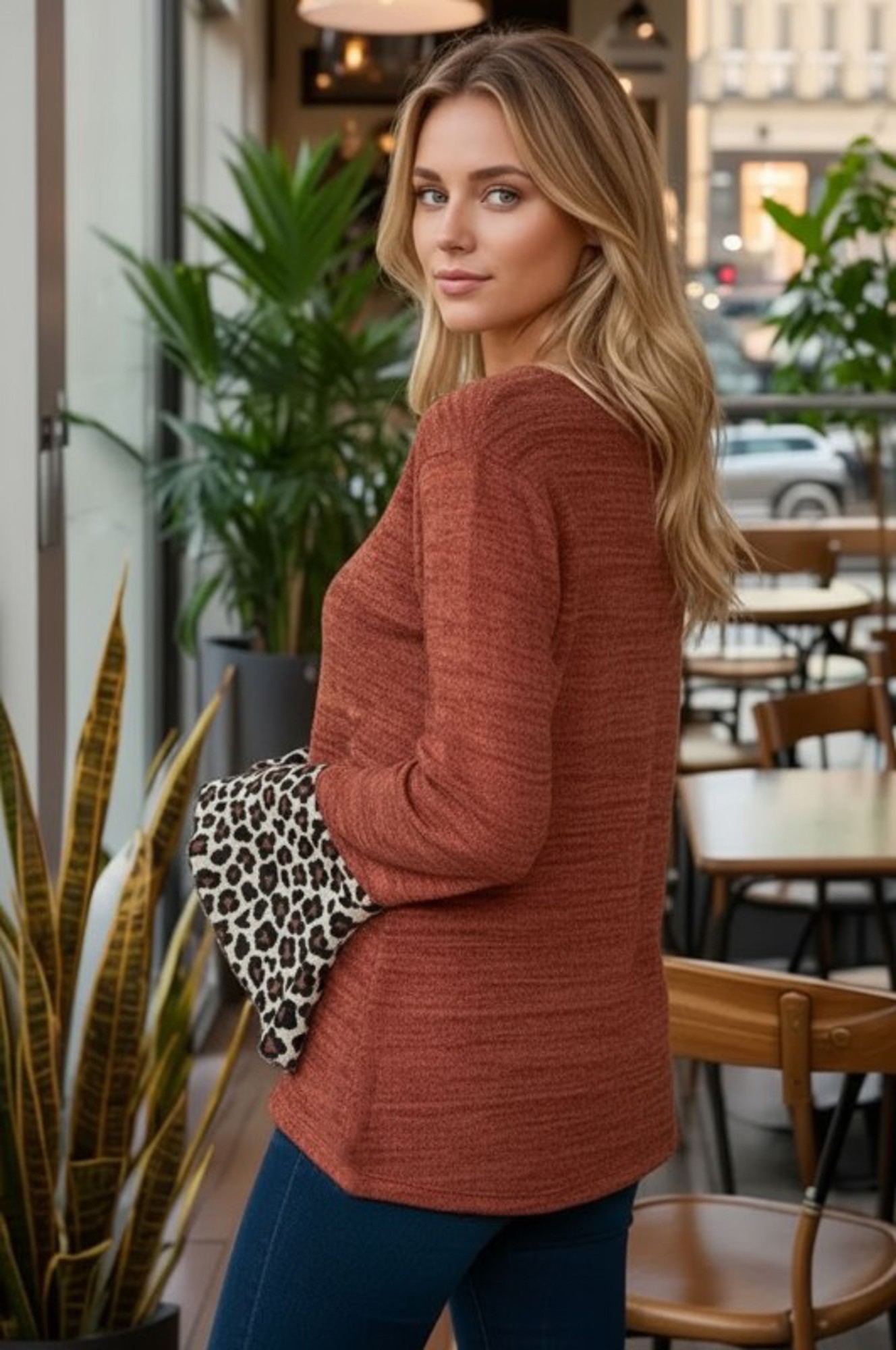 SOLID TUNIC TOP WITH ANIMAL PRINT BELL SLEEVES