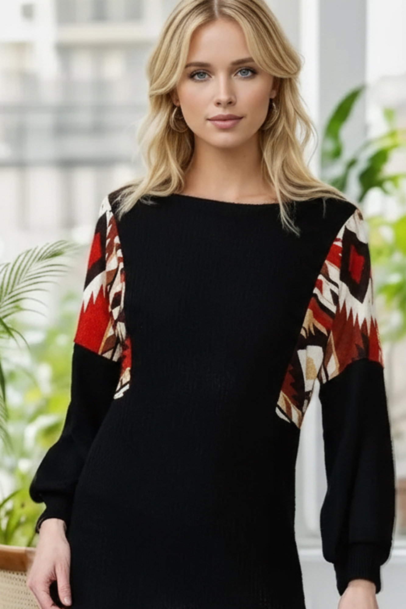 SOLID WAFFLE TUNIC TOP WITH AZTEC CONTRAST