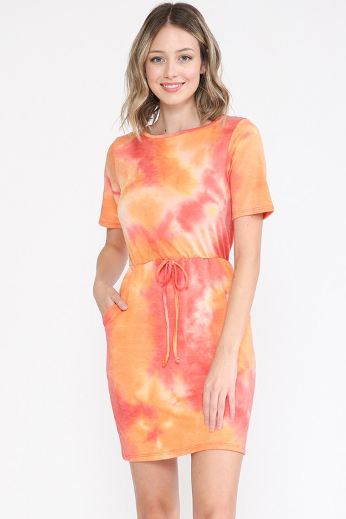 TIE DYE SHORT SLEEVE WAIST TIED DRESS WITH POCKETS