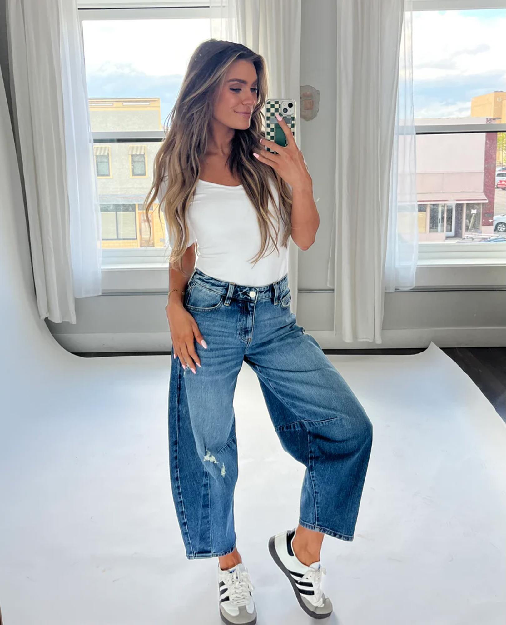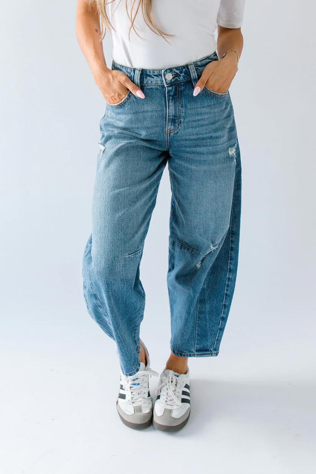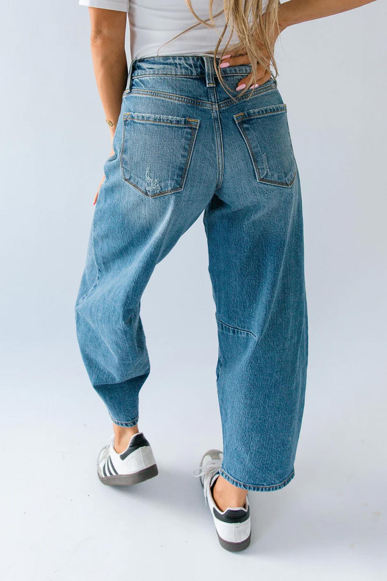 Introducing the Kancan Horseshoe Stretch Denim, with a high rise and relaxed fit through the hip and thigh. Featuring darting details and a 16" bottom opening, this jean offers a fun and flattering look for all body types. Get ready to turn heads with this playfully stylish denim!