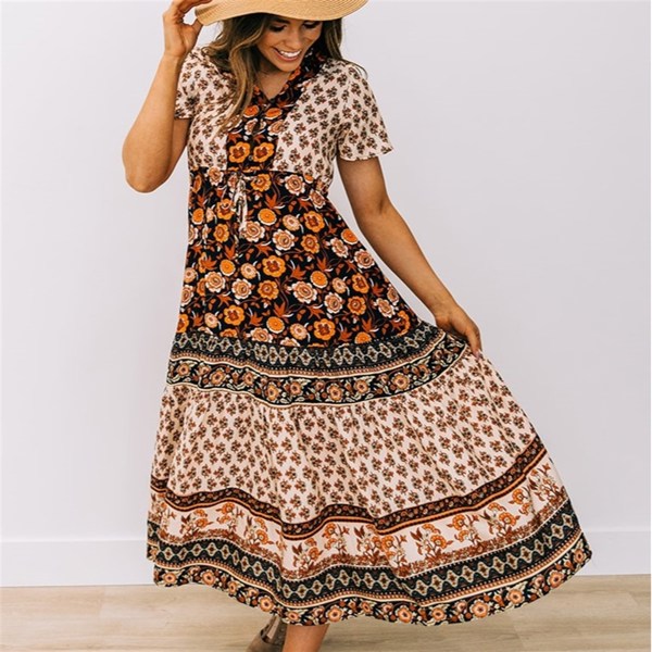 Just as pictured. I am 5’8” and DD and ordered the large. The bust region is a little more fitted than I would prefer, but the dress as a whole is gorgeous! Total BoHo vibes!