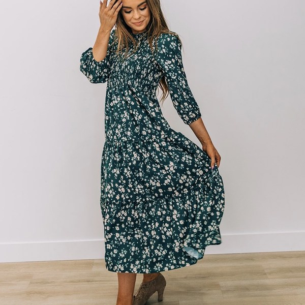 Fits more relaxed, than the pictures. Beautiful dress - has a lot going for it but I will have to figure out a way to make the waist cinch in more to make it more flattering. I am normally on the edge between a S and an M - I ordered an S and probably could have ordered an XS