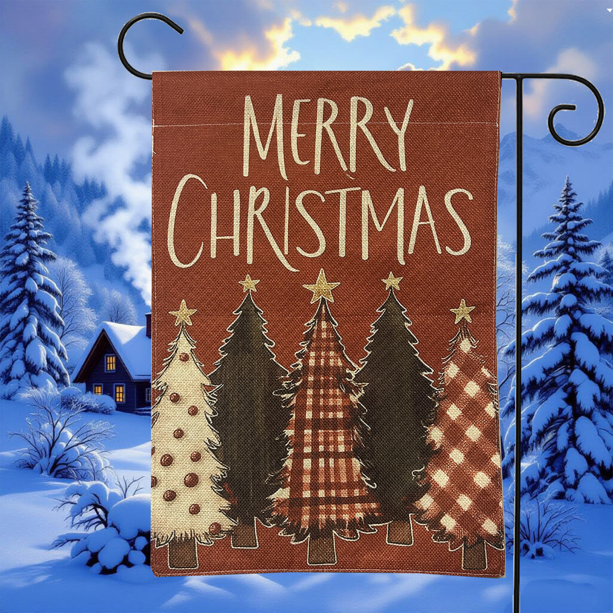 Bring festive farmhouse charm to your outdoor décor with this cozy Merry Christmas garden flag! Made from durable, weather-resistant burlap-style fabric, it features a row of beautifully patterned Christmas trees topped with golden stars against a warm red background. Perfect for adding holiday cheer to your porch, garden, or entryway, this flag is a wonderful way to welcome guests and celebrate the season in rustic style.