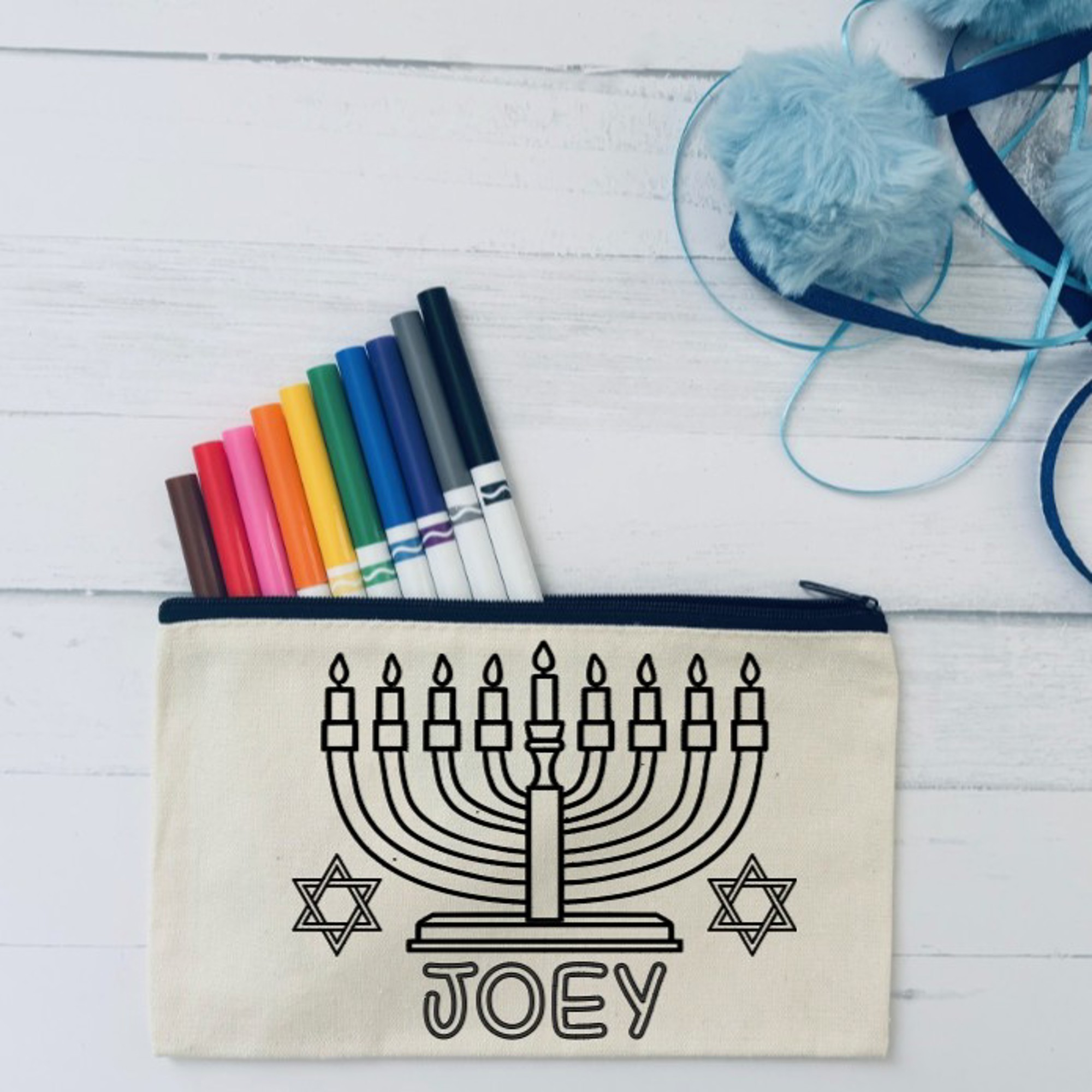 This personalized Jewish themed color your own bag kit is the perfect gift to celebrate the joy of Hanukkah for kids! It makes a great pencil case or can hold other items for kids.