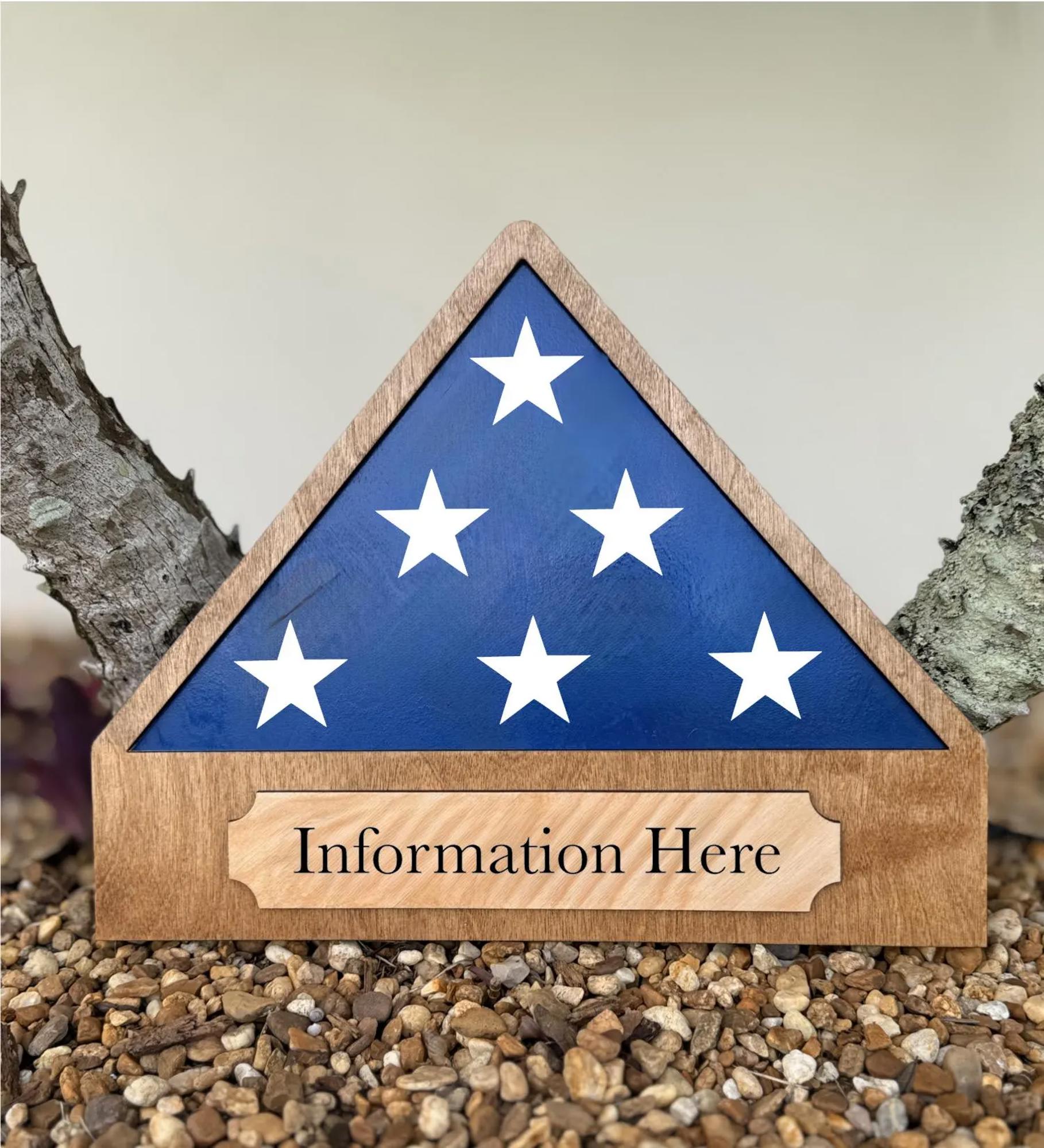 Honor the service and sacrifice of a loved one with this Custom Laser-Engraved Military Flag Tribute Plaque. Each piece is laser cut from premium wood and engraved with your personalized information on the nameplate section. The triangular flag design makes it a perfect companion for a folded memorial flag or a stand-alone patriotic display.