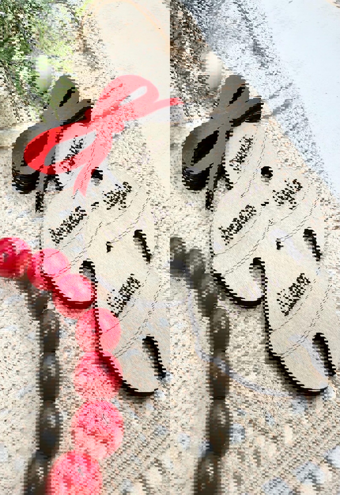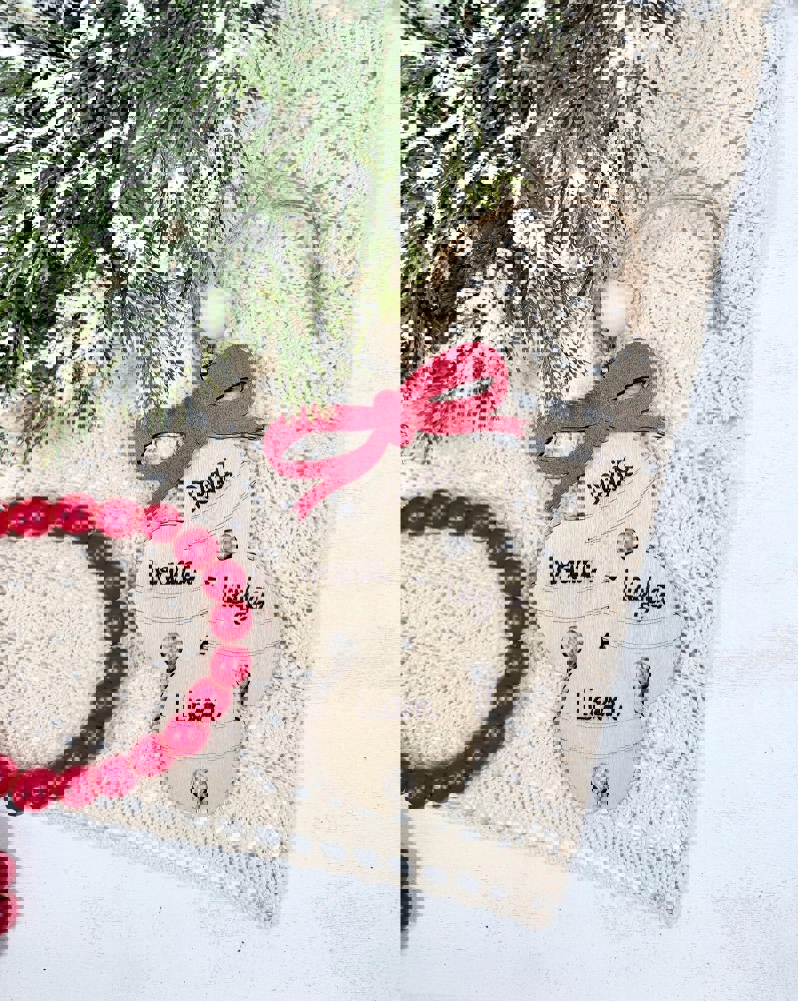 Arrives ready to hang on the tree with burlap twine and one wooden bead.