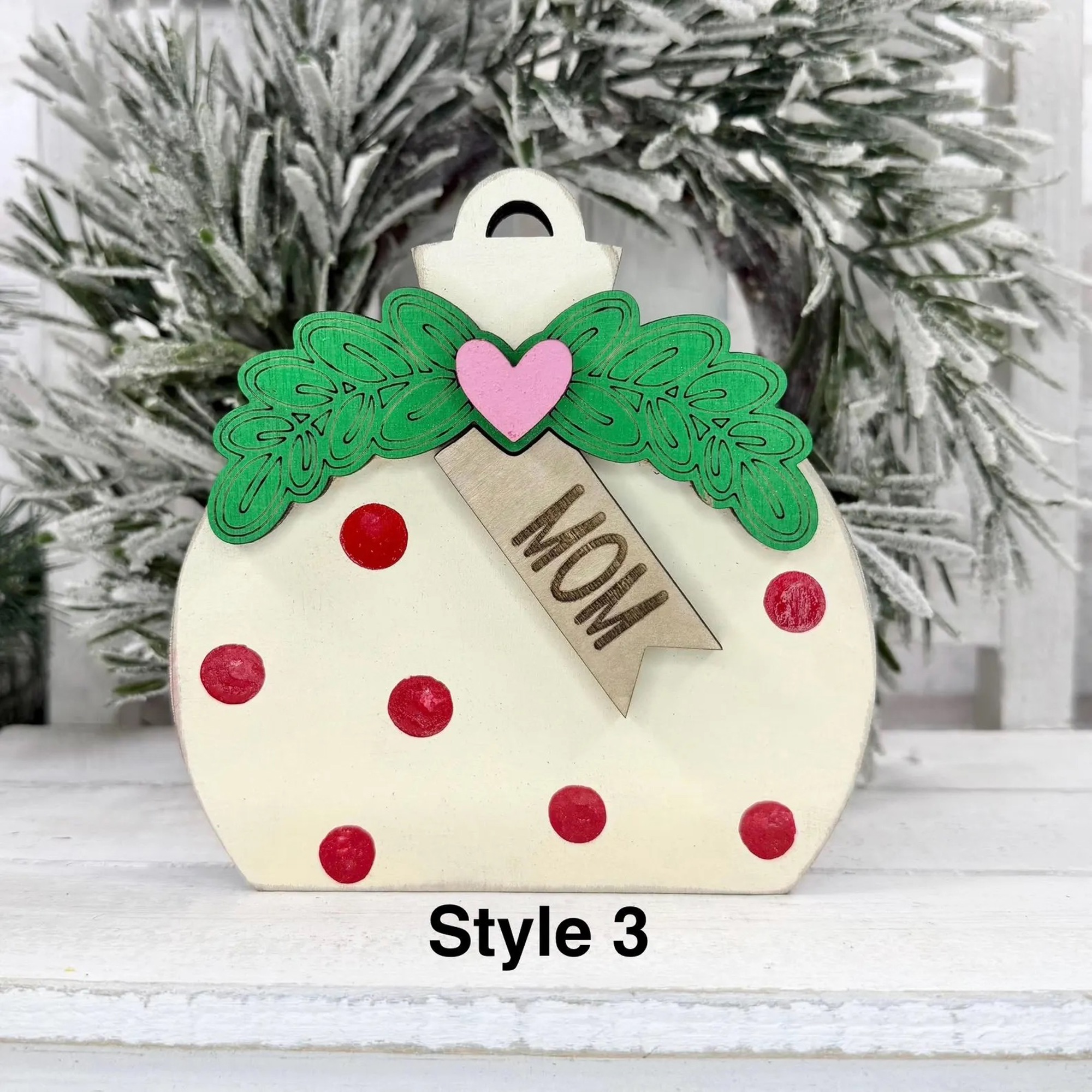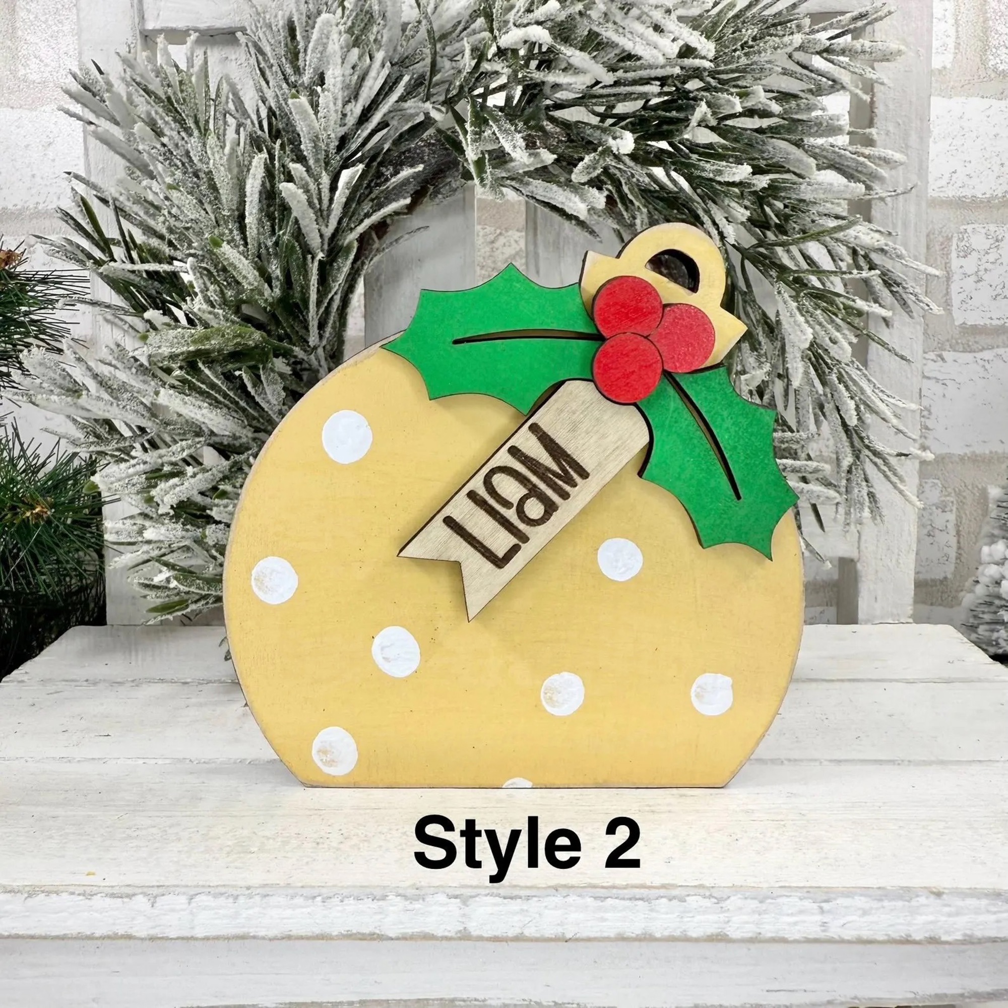 These personalized Christmas shelf sitter ornaments will be a great addition to your Christmas decorations. They will look great sitting on a fireplace mantle, bookcase, shelf, tabletop or wherever you love to decorate. Add personalization of your own names to each ornament.