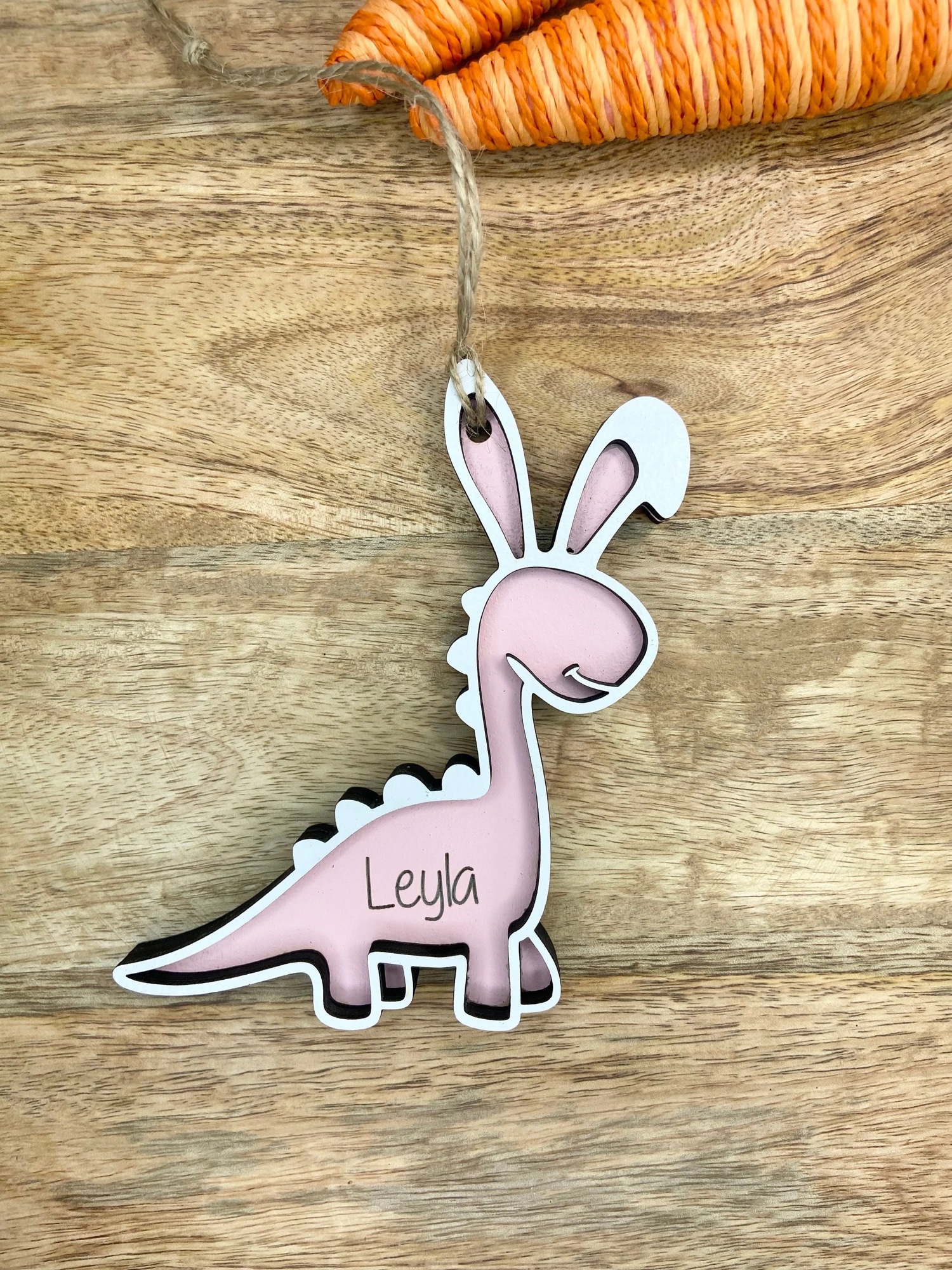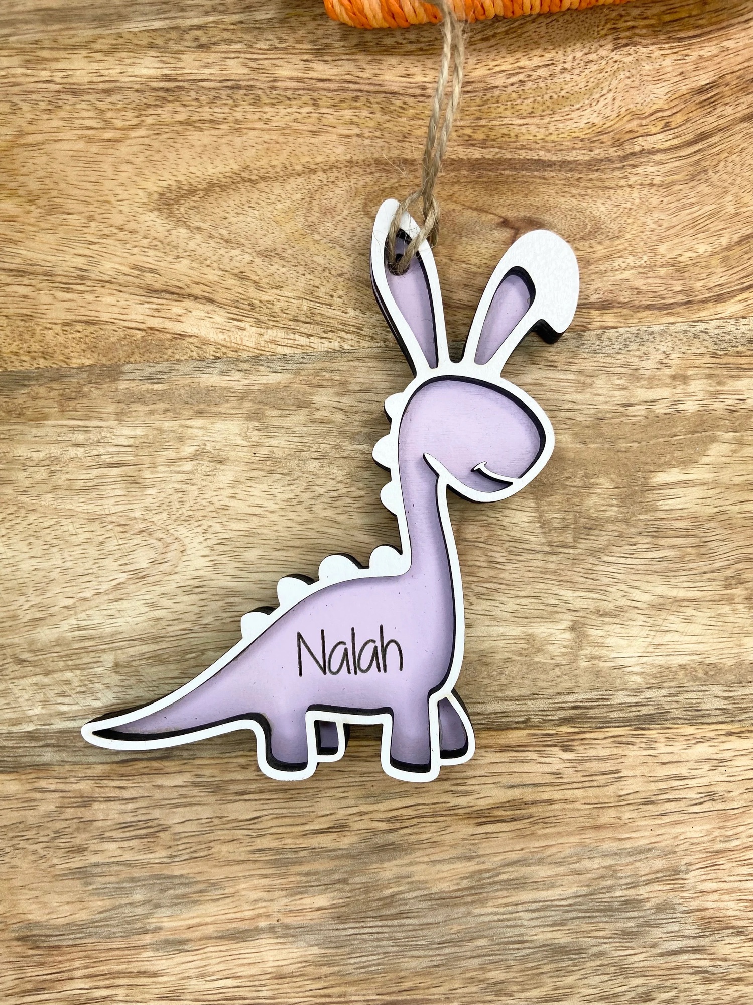 These dinosaur tags feature a raised white wooden layer and their name engraved.