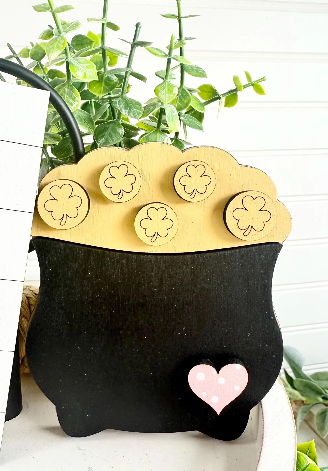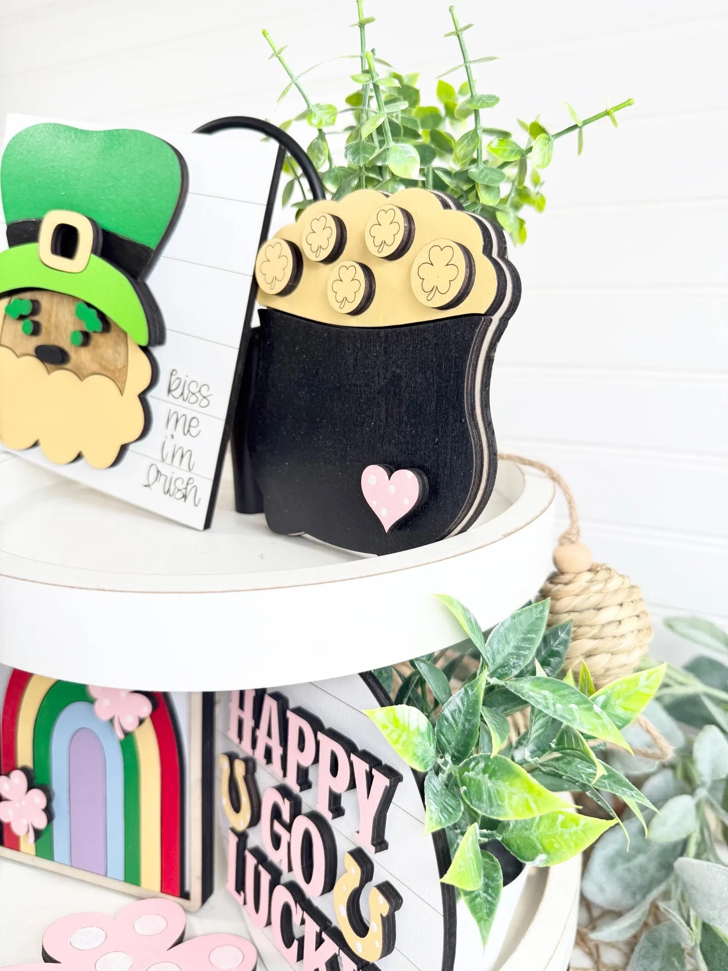 Bring a festive touch of Irish charm to your home with this St. Patrick’s Day tiered tray decor set. Featuring a cheerful leprechaun, pot of gold, rainbow, shamrock, and lucky-themed mini signs, this set is perfect for decorating tiered trays, shelves, coffee bars, or mantels during the spring season.