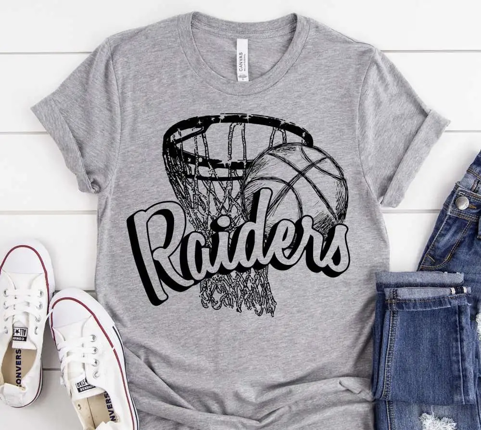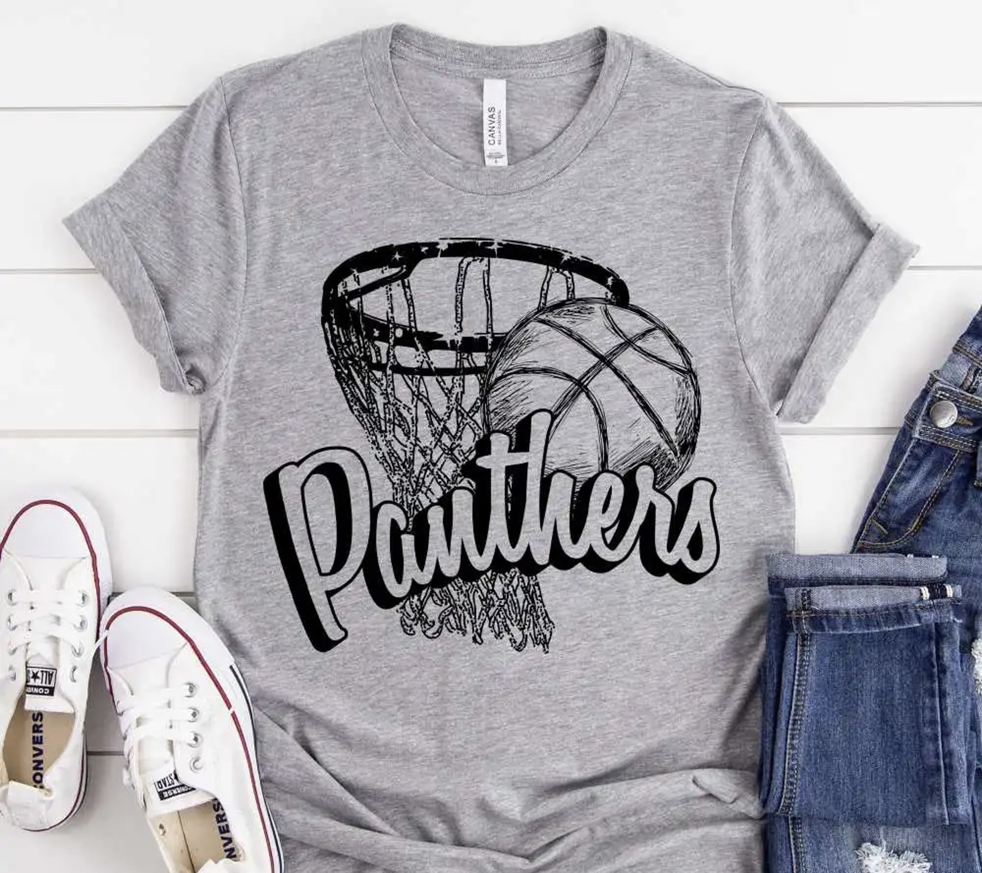 Each shirt features a detailed sketch-style basketball net and ball design — personalized with your school or team mascot in bold, vintage script. Choose from 30+ mascot options like Tigers, Eagles, Bulldogs, Cougars, and more, and customize your shirt and ink color to match your team spirit!