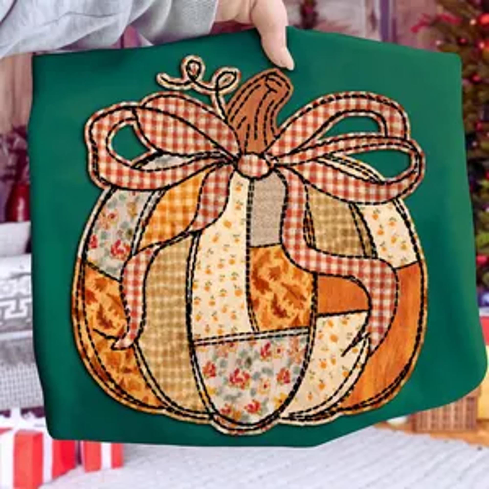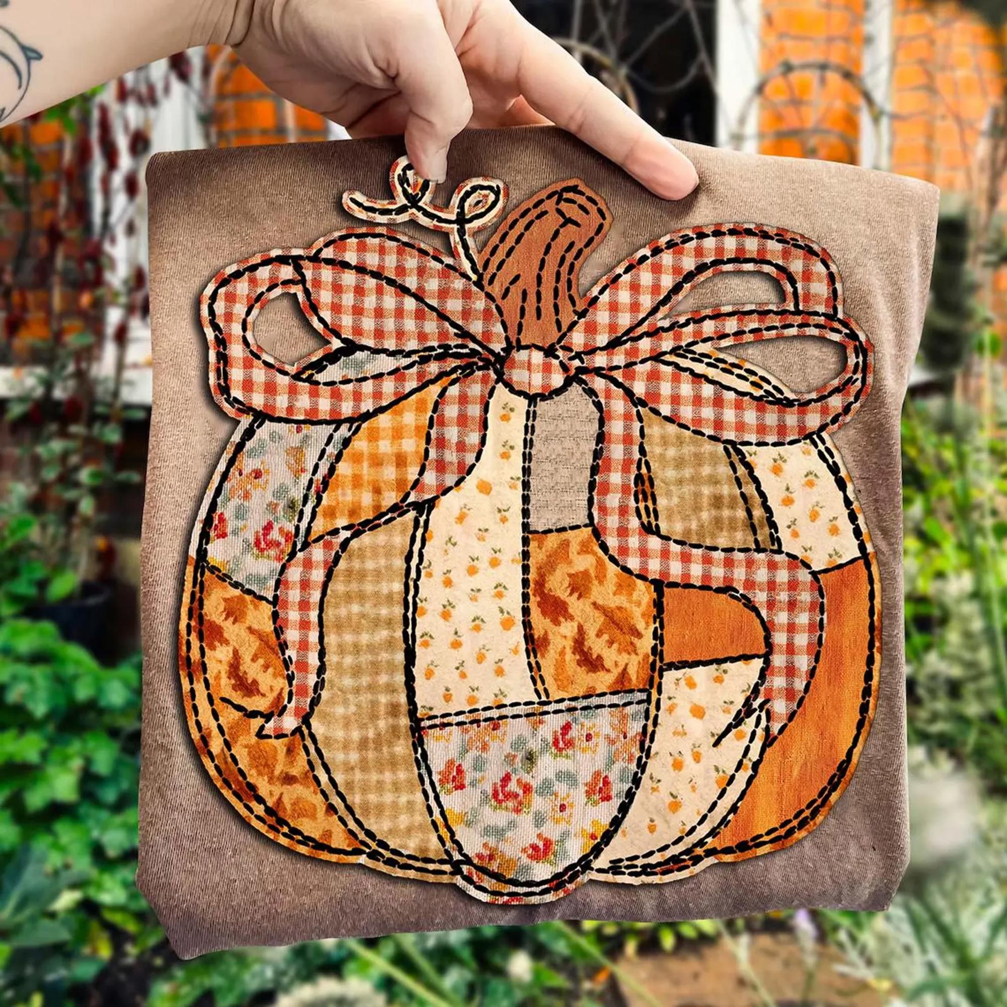 Celebrate the cozy vibes of fall with this adorable faux patchwork pumpkin tee! Featuring a charming patchwork-style pumpkin topped with a bow, this shirt is perfect for autumn lovers, pumpkin patch trips, and casual fall days.