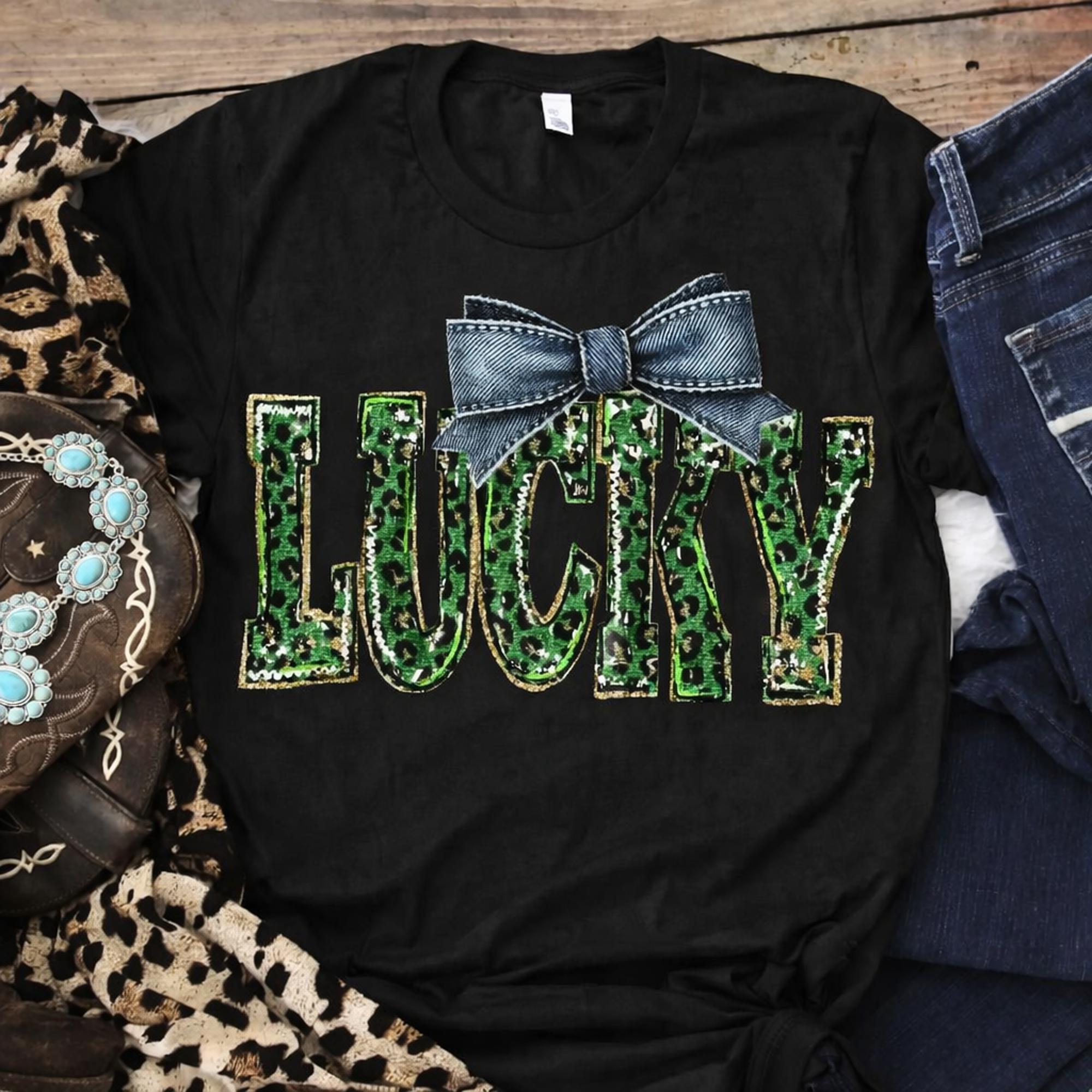 This Faux Sequin Lucky Bow Tee features green leopard “LUCKY” lettering with a faux sequin and faux denim bow print for a bold western-inspired look — no real sequins or fabric bow.