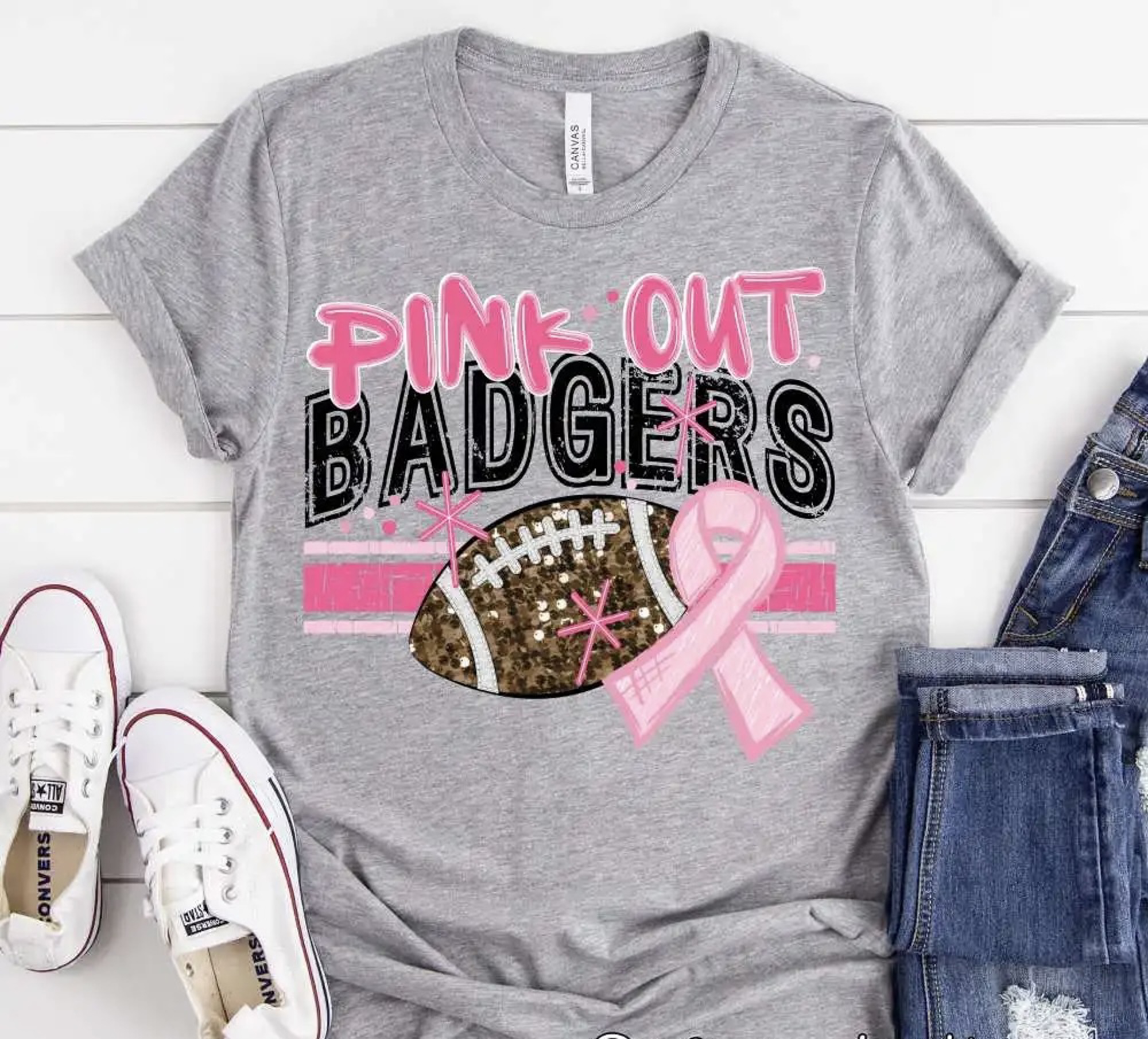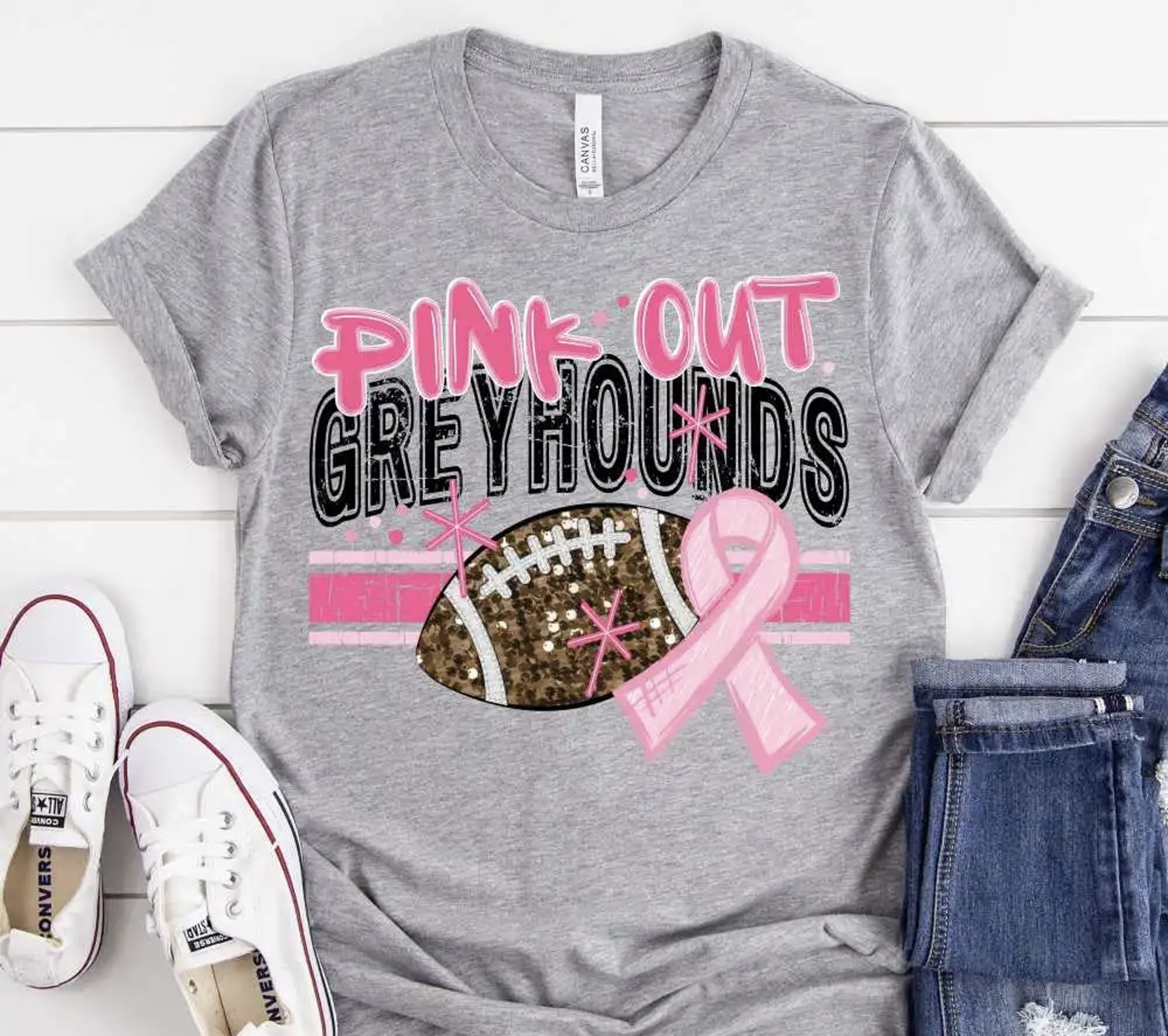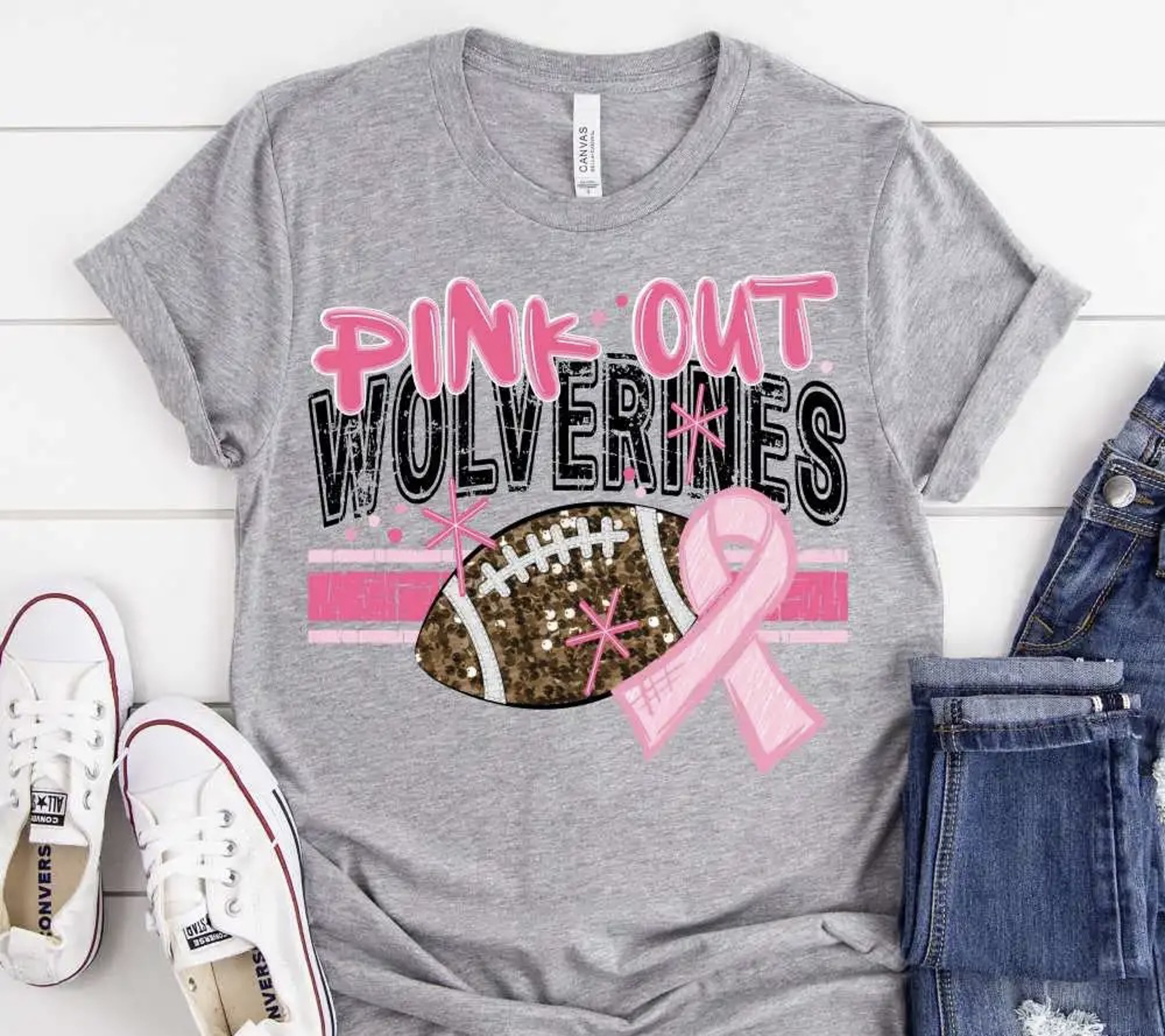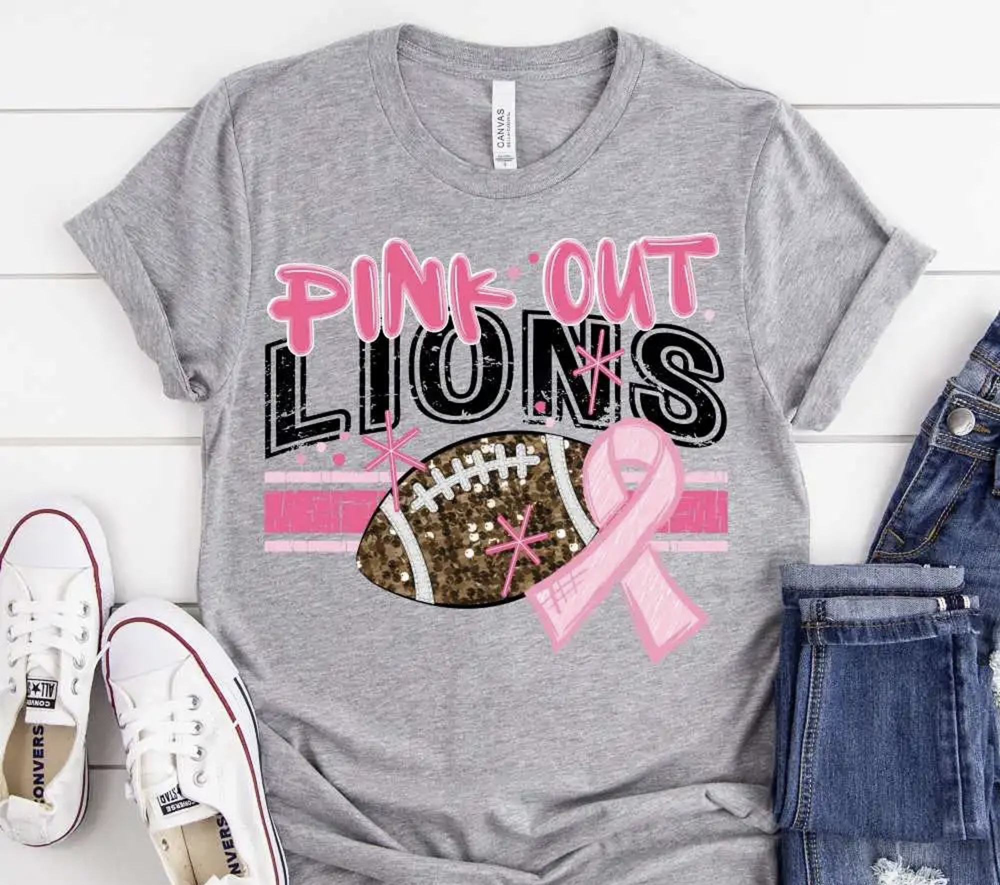 Show your school spirit while supporting a powerful cause with our Pink Out Mascot Tee! 💕 This design features bold lettering, a glitter-look football, and the iconic pink ribbon — perfect for October’s Breast Cancer Awareness games.