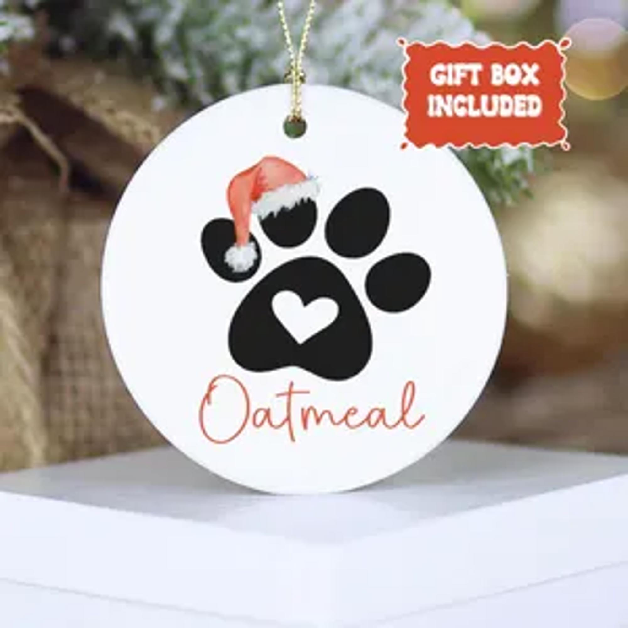Dog or Cat Christmas Ornament; Personalized with Pet's Name; Green, Gray, Black or Brown Paw; Santa Hat, Bow, or Christmas Lights Accents
