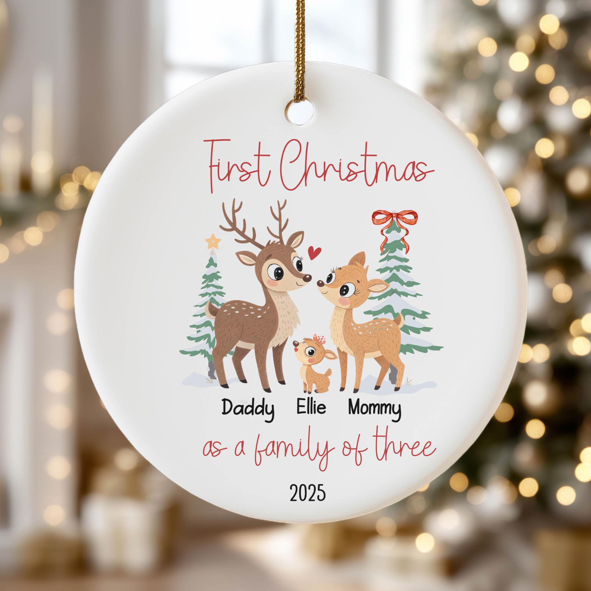 Celebrate a magical first Christmas as a family of three with this beautifully crafted personalized ornament. Featuring a charming family of deer — a mommy deer, daddy deer, and baby deer — standing together in front of snow-covered Christmas trees, this ornament captures the warmth and wonder of the holiday season.